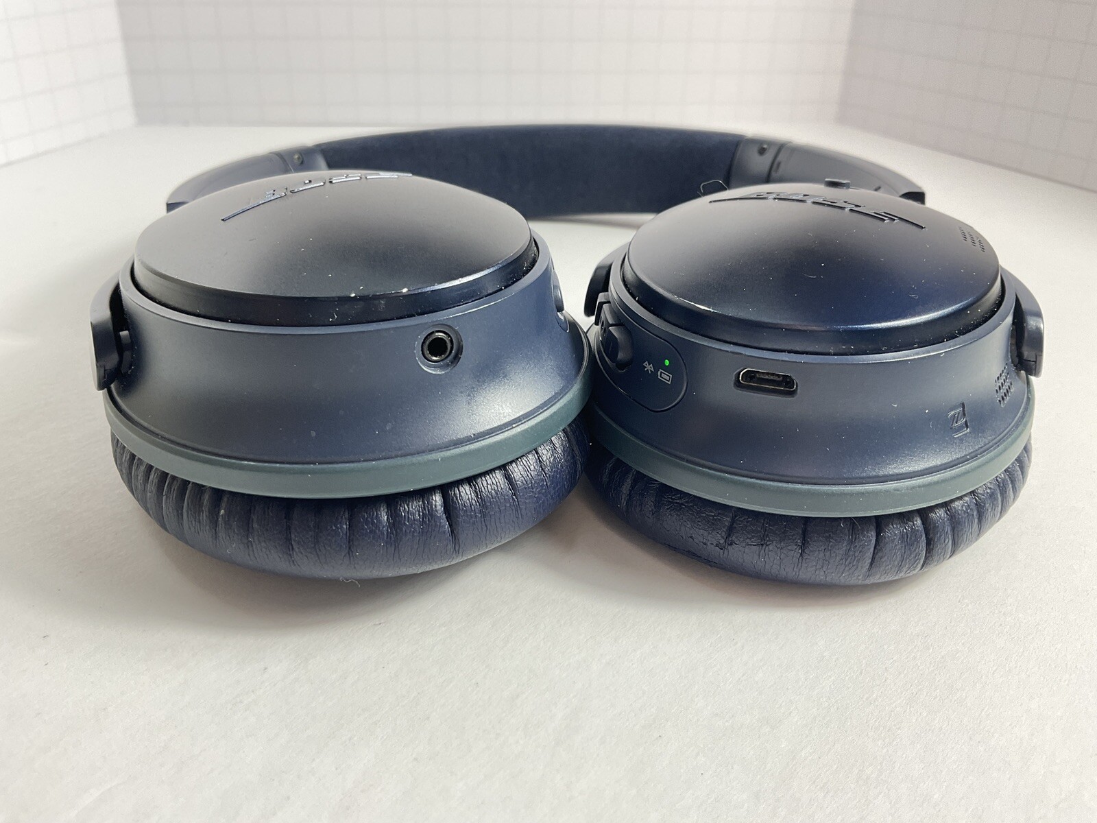Bose QC35 II QuietComfort Over-Ear Bluetooth Headphones Blue Pre Owned Comes with the Headphones, 3.5 wired jack, charge cord & case you see pictured. Headphones have been cleaned & tested, they are in good working condition, sound is good no static… Headphones show normal signs of wear, there is some scratches, nicks on the metal mark of the headphones. See pictures..Ear cushions are still good, Normal signs of use… These are Used—-Pre Owned and will show signs of use…normal dings, dents, scraps etc...from daily use.... Please look over pictures carefully as they are part of the description, Selling as is. Please ask any and all questions prior to bidding. Condition is Pre-owned. All serial numbers will be sent once the auction is over and paid for. All serial numbers will be recorded for our records.