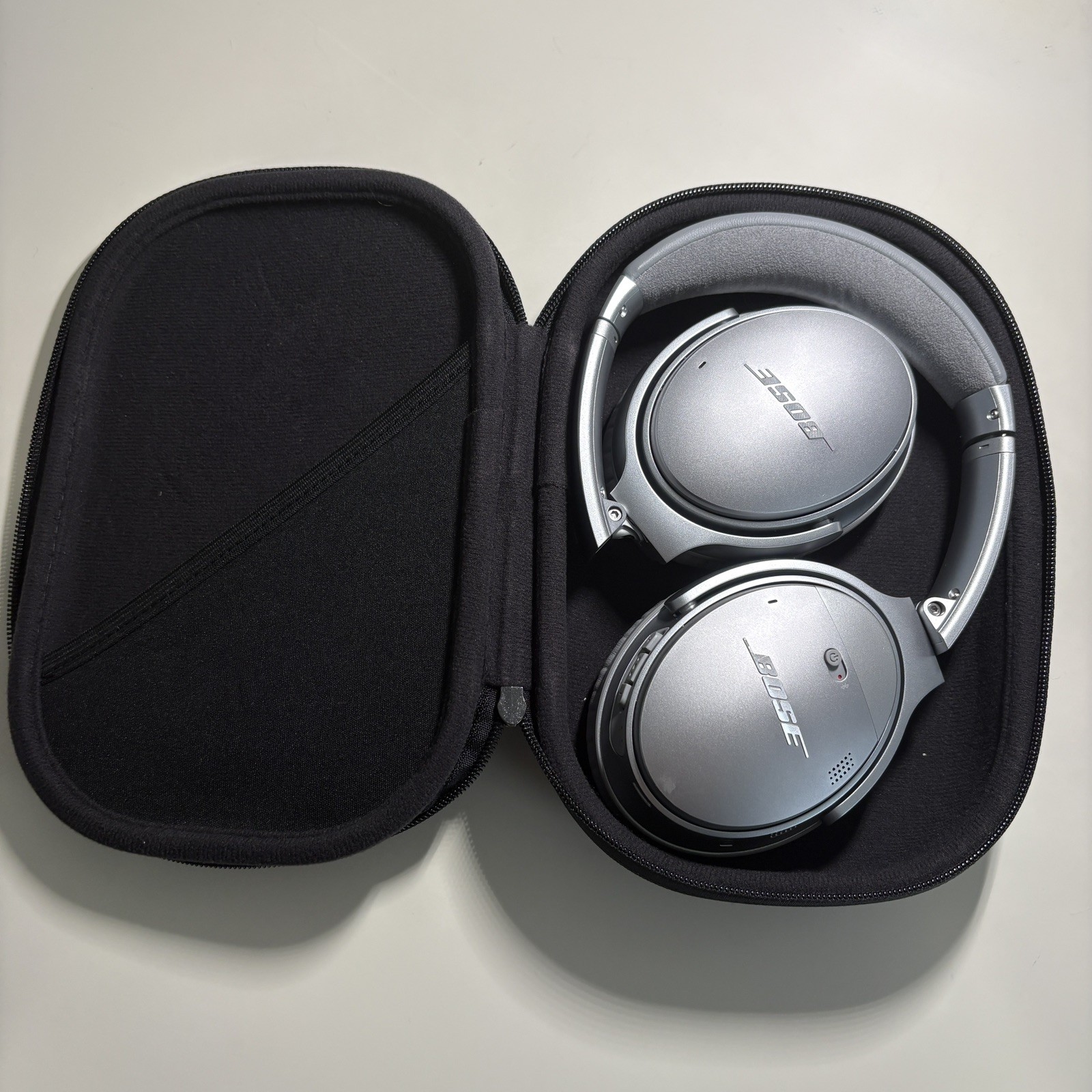 Bose QC35 QuietComfort noise canceling, bluetooth headphones and Bose case. Headphones are used, but in good to very good condition. They work 100%, no damage, no missing screws, takes a good charge. Case is in very good shape. What you see is what you'll get; Just headphone and case. No instruction manual or charging cord (uses the standard USB-MicroB)