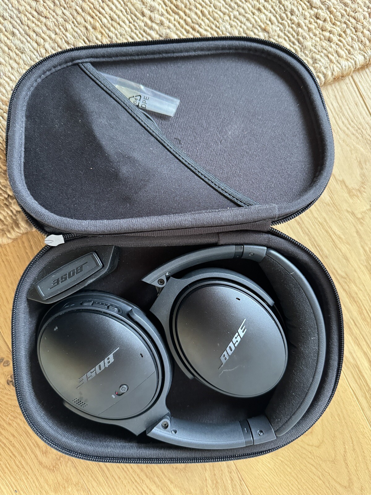 Enjoy your favorite music with these wireless over-ear headphones from Bose. The Bose QuietComfort 35 II delivers a high-quality and immersive sound experience with its surround sound and active noise cancellation features. It has a sleek black design and adjustable headband for a comfortable fit. The headphones can easily connect to your device through Bluetooth. It also has a built-in microphone for taking calls and a rechargeable battery for long hours of listening. Includes: Case Airline adaptor Charging cable AUX cable :Slight bend in one end but still works and easy to replace