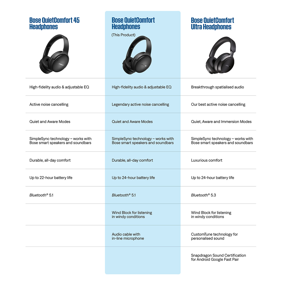 Legendary noise-cancelling technology that combines tech and passive features to shut off the outside world. Quiet and Aware Modes let you make the most of any musical moment by choosing between full noise-canceling or awareness. Supercharge your favorite tracks with high-fidelity audio and Adjustable EQ that puts you in control of bass, mid-range, and treble settings. QuietComfort Headphones hold up to 24 hours of battery life keeping even marathon playlists playing. Powered by Frooition Payment & Returns Support Newsletter Home Audio Car Electronics Televisions and Video Portable Electronics Sale Bose QuietComfort Headphones with Active Noise Cancellation - Pair (White) Product ID #: QCWHTPR BRAND NEW / FACTORY SEALED / AUTHORIZED DEALER Product Information Product Information About Us Payment Returns Shipping Product Information This Package Includes (2) QuietComfort Headphones with Active Noise Cancellation Go Beyond the Beat Chin up shoulders back music blasting. Press play and take charge of your music with Bose QuietComfort noise-cancelling headphones. With customizable high-fidelity audio and the ability to shut out outside noise as you please these over-ear headphones come in an iconic design with colors that are as bold as you. So strut and stride along to the beat with sound that puts you on top of the world. Features Legendary noise-cancelling Adjustable EQ and customizable listening modes All-day comfort with Quiet and Aware Modes Strong reliable wireless connection with Bluetooth ® 5.1 Wind Block Up to 24 hours battery life Control the Sound Take charge of what you hear and what you don’t. These wireless headphones come with legendary noise-cancelling technology that works its magic by sealing you in with high-fidelity audio eliminating distractions and letting you dive deep into your own rhythm. Own the Beat Drop the Bass Control the music from your Bluetooth headphones as you please with the Bose Music app. Adjustable EQ allows you to crank the bass tweak the treble and balance the mid-range to get the sound that best suits you. You can also manage your Bluetooth connections change your VPA check your battery life adjust your noise-cancelling presets and more. Plug in the included audio cable for headphones wired to bold sound even when there’s no Bluetooth connection. Modes For Any Musical Moment You decide how much of the outside world you let in. These over-ear headphones come equipped with Quiet and Aware Modes that let you toggle between full noise cancelling or full awareness of your surroundings. Or better yet create your own custom mode and have the power to adjust the noise cancellation as you see fit add Wind Block to tune out breezy environments and revisit the custom setting at any time. Power Up Your Sound QuietComfort noise cancelling headphones are ready for even your marathon playlists with up to 24 hours on a single charge using a USB-C®. A quick 15-minute boost gives your Bluetooth headphones up to 2.5 hours of playtime. Premium Materials. Bold Design. Black White Smoke and new limited-edition Cypress Green headphones pair with an iconic comfortable design to give you a fashionable look you can rock all day and night. The plush ear cushions are perfect for long listening sessions and the secure yet comfortable headband uses steel in just the right places to optimize both strength and feel. The underside of the band uses soft protein-leather-covered foam to rest your over-ear headphones gently on your head. Bose SimpleSync With Bose SimpleSync technology you can pair your Bose QuietComfort noise-cancelling headphones with select Bose smart soundbars and speakers for a personal TV listening experience. Independent volume controls allow you to lower or mute your soundbar while keeping your Bluetooth headphones as loud as you like. Away from your phone? No app no problem. Press and hold the Bluetooth button on each device to group and sync their sound. You can now also connect to a pre-existing group or smart device at a moment’s notice by pressing the Action button on the connecting device. Browse Music Without Touching Your Phone Spotify Tap gives Spotify users the power to access their music at the press of a button. Press and hold the “Action” button on the left earcup of your around-ear headphones to start your listening session and press down again for Spotify to offer up recommendations for other music you might like. Set your shortcut to “Spotify” in the Bose Music app to enable this feature. What's in the Box QuietComfort Headphones with Active Noise Cancellation Carry Case USB-C (A to C) Audio Cable (12") Audio Cable with In-Line Microphone Safety Sheet Specifications Battery Approx. Battery Life: Up to 24 hours Quick Charge: 15-minute charge provides up to 2.5 hours of playtime Inputs and Outputs Bluetooth: Yes (5.1) USB Input: USB-C Headphone Jacks : Yes (2.5mm audio jack) Materials Ear Cushion/Tips Material: Leather Removable Ear Cushions/Tips: Yes Adjustable Headband: Yes Product Case Material: Hard Leather Noise Cancellation Active Noise Cancelling: Yes Adjustable Noise Cancelling: Yes General Weight: 1 lb Dimensions: 6.18” x 7.67” x 3.14” Voice Prompt Languages: English Chinese (Mandarin) Chinese (Cantonese) French German Italian Japanese Spanish (Mexico) About Us About Us World Wide Stereo: Awe Inspired. Since 1979. For four decades, World Wide Stereo has delivered the world's finest consumer electronics and home entertainment products . With two award winning stores, a brand new distribution center and one of the largest design and installation of Audio/Video departments in the country, we know what?s good and what?s not. We are very selective about what we sell, and we are an Authorized Reseller for every brand we represent. You can shop with confidence and know that you?re buying top-quality, new merchandise with a valid manufacturer?s warranty and best-in-class support. As a family-owned business, we live by our rep