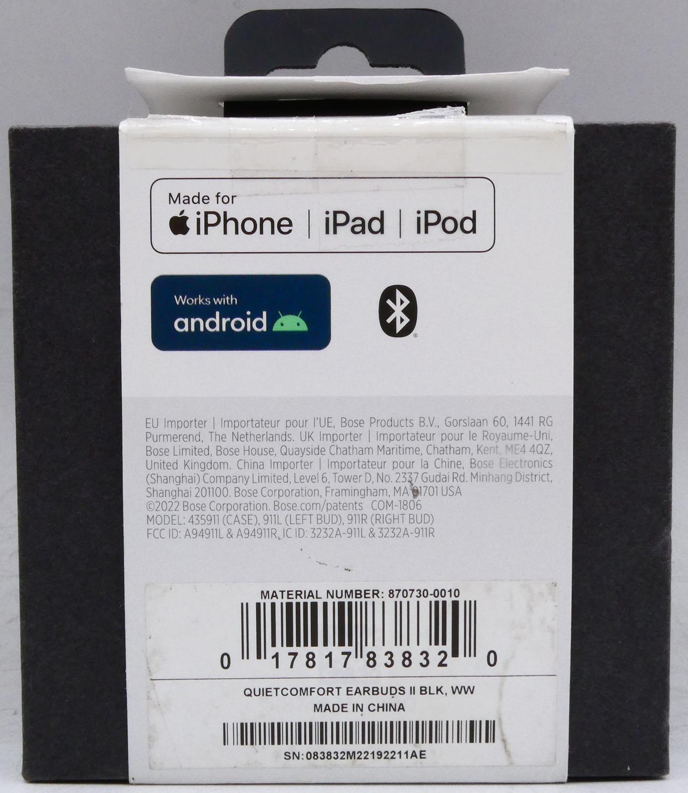 BOSE QUIETCOMFORT II WIRELESS BLUETOOTH EARBUDS #107090# THIS PACKAGE INCLUDES THE BOSE QUIETCOMFORT II WIRELESS EARBUDS. THIS PRODUCT COMES WITH 3 PAIRS OF EARTIPS, 3 PAIRS OF STABILITY BANDS, CHARGING CASE, USB-C CHARGING CABLE, AND A QUICK START GUIDE ALONG WITH ITS ORIGINAL RETAIL PACKAGING! THIS PRODUCT HAS BEEN TESTED, IS FULLY FUNCTIONAL, AND IS IN EXCELLENT CONDITION! THE IMAGES MAY NOT BE A EXACT REPRESENTATION OF THE PRODUCT YOU RECIEVE! This BOSE QUIETCOMFORT EARBUDS II is in working condition. URT is confident in the quality of our product. URT Outlet is an experienced reseller and a company highly rated in the field of electronics remarketing. We offer affordable, reliable, new and used products. Item is USED If the item you receive does not match your order or the description: Contact us and we will remedy the situation Items listed with a stock photo: Product will be the same model and description in the listing, but may not be the item pictured. This item will be similar to the item you receive. If packaging or box is included with the item it will have signs of use and may not be in new condition - may have damaged or dirty packaging Have additional questions or concerns? Please e-mail us and we will get back to you as soon as possible. Please review the detailed specifications below. BOSE QUIETCOMFORT II is working as this product is intended for. CHARGING CABLE: INCLUDED WIRELESS: YES BLUETOOTH CONNECTIVITY COLOR: TRIPLE BLACK ACTIVE NOISE CANCELLING (QUIET MODE) TRANSPARENCY FUNCTION (AWARE MODE) ADJUSTABLE EQ WITHIN BOSE APP 6-HOUR BATTERY LIFE WITH A SINGLE CHARGE SIMPLE TOUCH CONTROL MOISTURE RESISTANT About the shipment: This item will be professionally packaged so it makes it safely to you. Items don’t include any additional parts, cables or accessories, unless, otherwise stated in the description of the product. Features Details Fast Shipping Your order will be processed with speed and efficiency. We strive to provide excellent service and you can expect your order to be handled within one business day. We also offer fair shipping costs, ensuring that you receive your items in a timely manner without breaking the bank. Competitive Pricing Our pricing model is dynamic, ensuring that our prices are always competitive. In fact, we pride ourselves on offering some of the lowest prices available on the internet. You can have peace of mind knowing that you're getting a great deal when you choose to purchase with us. 30-day Money Back Guarantee Our top priority is your satisfaction throughout this transaction. If, for any reason, you are dissatisfied with the product, we offer a hassle-free return policy within 30 days. Whether you prefer a partial refund, full refund or a replacement, your request will be promptly accommodated. Rest assured that we are dedicated to ensuring your 5-star satisfaction.
