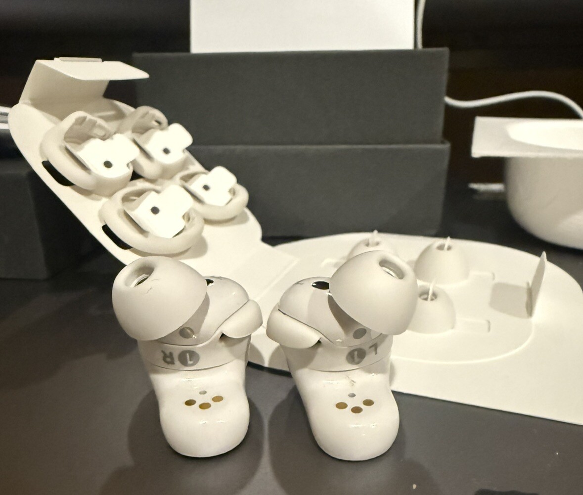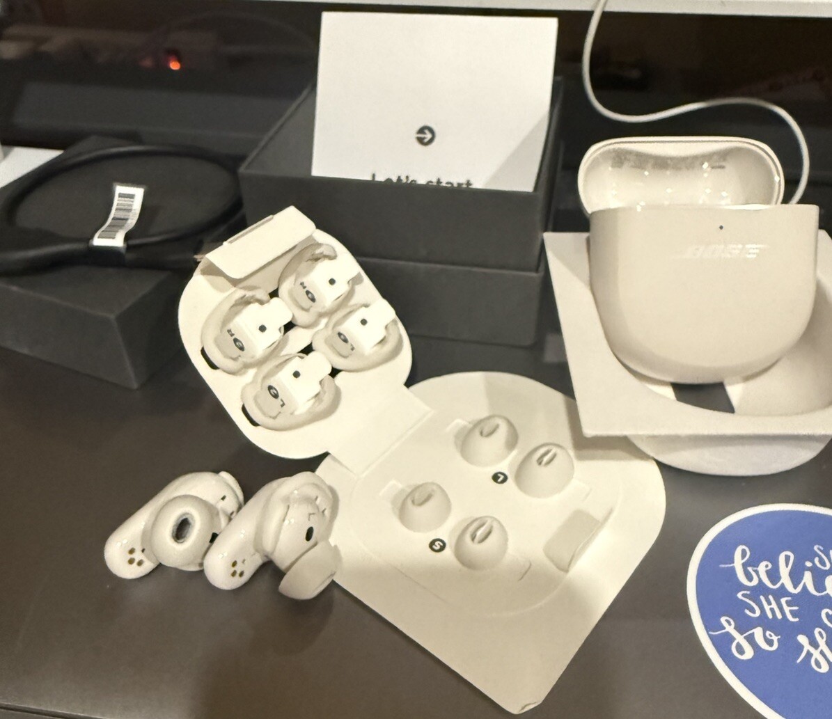 Bose QuietComfort Noise Cancelling Earbuds II - White. Missing the outer cover slip to go over the box, otherwise it’s got all the original packaging and accessories. These headphones are in excellent used condition. Only used maybe less than 10x. The only slight imperfection would be a tiny chip on the R ear bud from dropping on the ground once. Otherwise the headphones are in perfect cosmetic condition. Purchased directly from Bose online to ensure authenticity. All sales are final. Please make payment within 2 days end of listing. Tracking will be provided upon shipping.