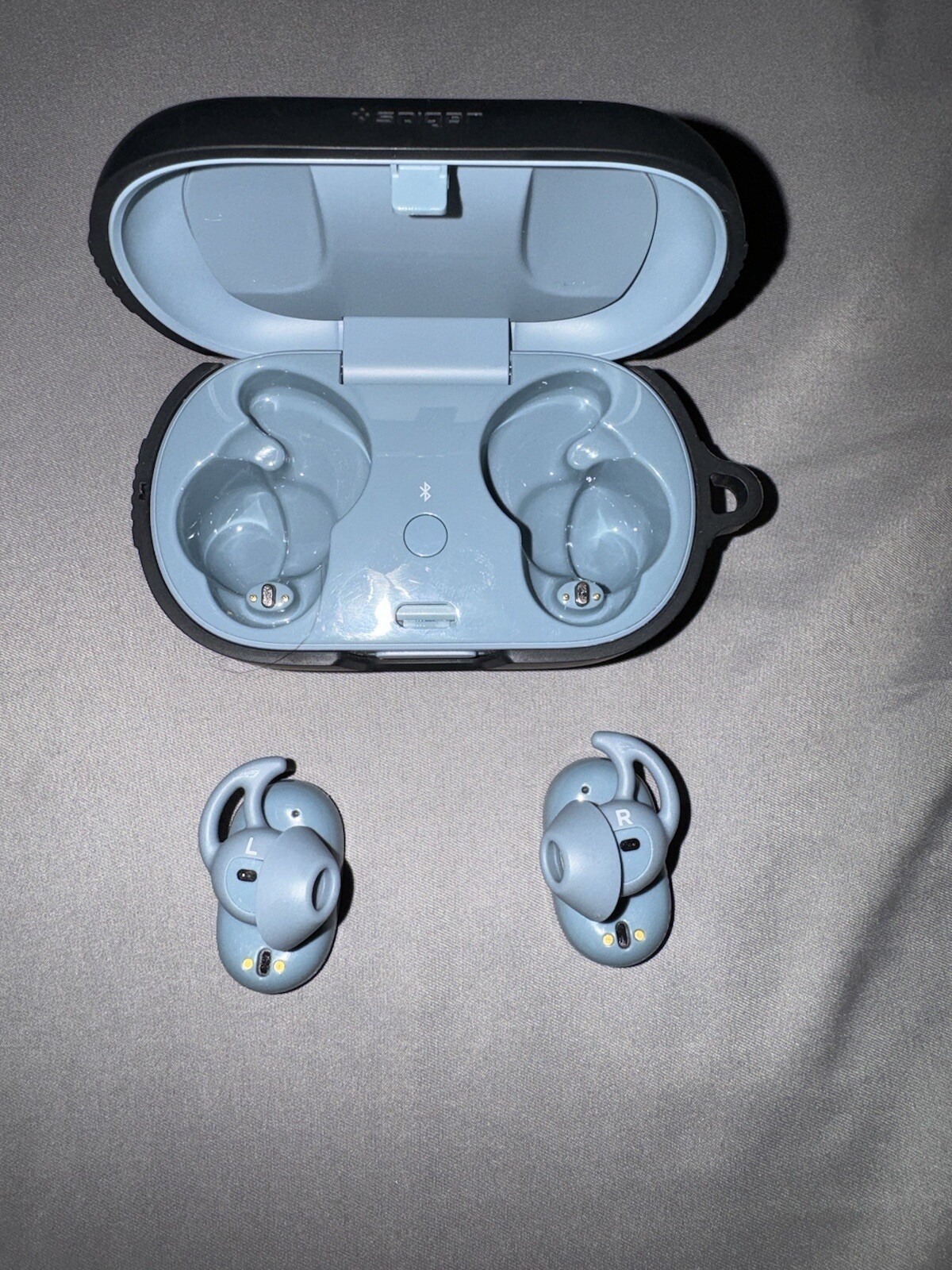 Experience the ultimate in audio quality with these CASE INCLUDED.,limited edition Bose QuietComfort Earbuds in Stone Blue. These earbuds feature advanced noise-cancelling technology, making them perfect for commuters and travelers alike. With easy Bluetooth connectivity, you can seamlessly switch between music and phone calls on the go. The sleek design and comfortable fit make these earbuds perfect for everyday wear. The Bose QuietComfort Earbuds are available in a beautiful Stone Blue color and are perfect for anyone who wants to enhance their audio experience. These earbuds are compatible with any Bluetooth-enabled device and feature wireless technology for added convenience. With their advanced features and easy-to-use design, these earbuds are a must-have for anyone who loves to listen to music or take phone calls on the go.