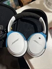 Enjoy your music on the go with these wireless Bose Soundlink over-ear headphones. They come with a sleek white and teal design, and include a handy case for when you're not using them. The headphones feature an adjustable headband to fit your head, volume control for easy adjustments, and built-in on/off switch to conserve battery life. These headphones also have replaceable earpads and an in-line control for added convenience. They are compatible with Bluetooth and have a 3.5mm jack for easy connectivity. The Bose Soundlink headphones are perfect for any music lover who wants to enjoy their tunes without the hassle of cords. New ear pads