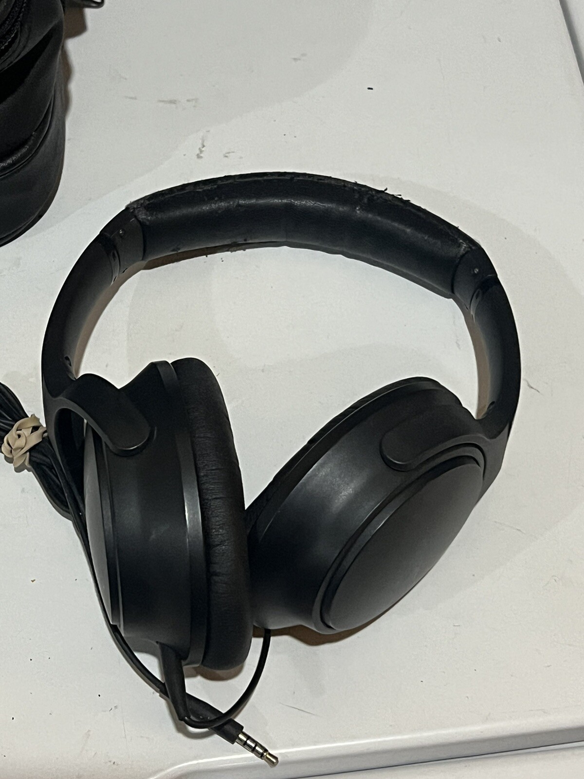 In good working condition. Do show signs of use but work. As you can see in the pictures the headband is flaking but ear pads look ok. Comes as pictured with case