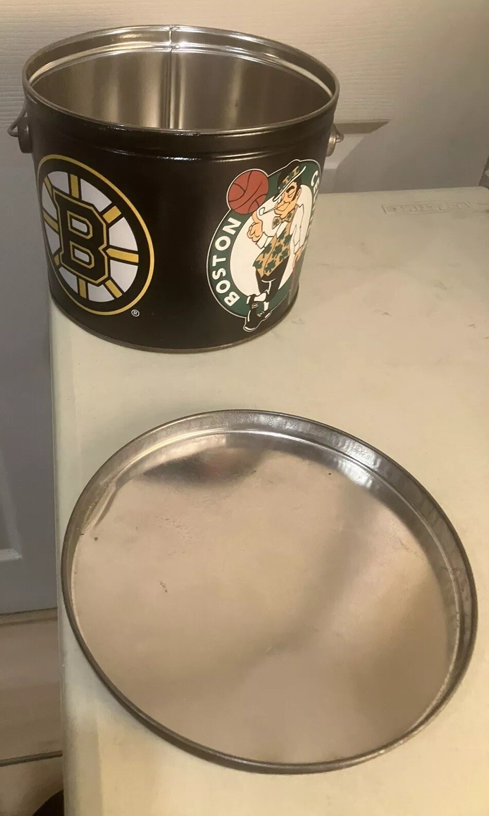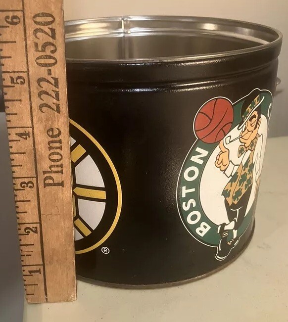 This collectible metal tin features the iconic Boston Bruins and Celtics logos, making it a must-have for any basketball fan. Measuring 61/2 inches in diameter and 51/2 inches in height, this tin is perfect for storing your favorite snacks or other small items. It's a great addition to any sports memorabilia collection and is sure to impress your fellow fans. The tin is made from high-quality materials and features a durable finish, ensuring that it will last for years to come. Whether you're a die-hard Boston Bruins fan or simply love basketball, this metal tin is a great way to show your support for your favorite team.