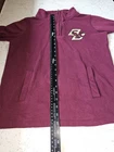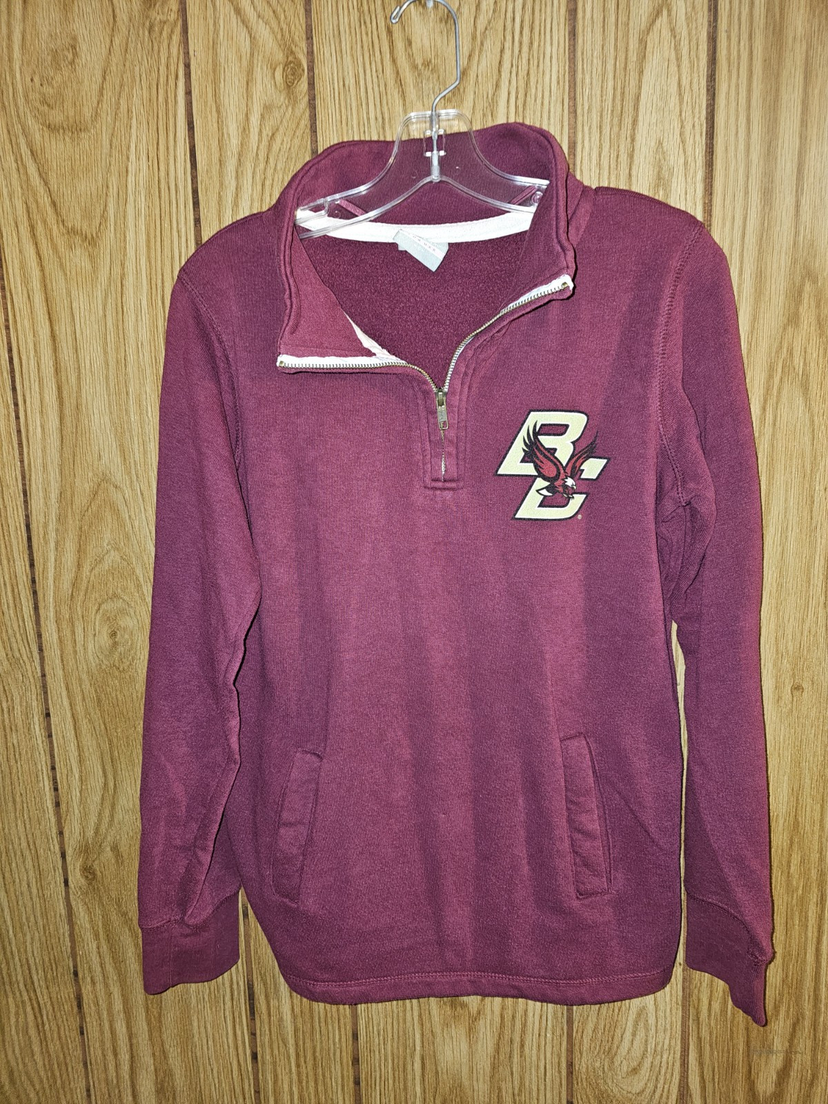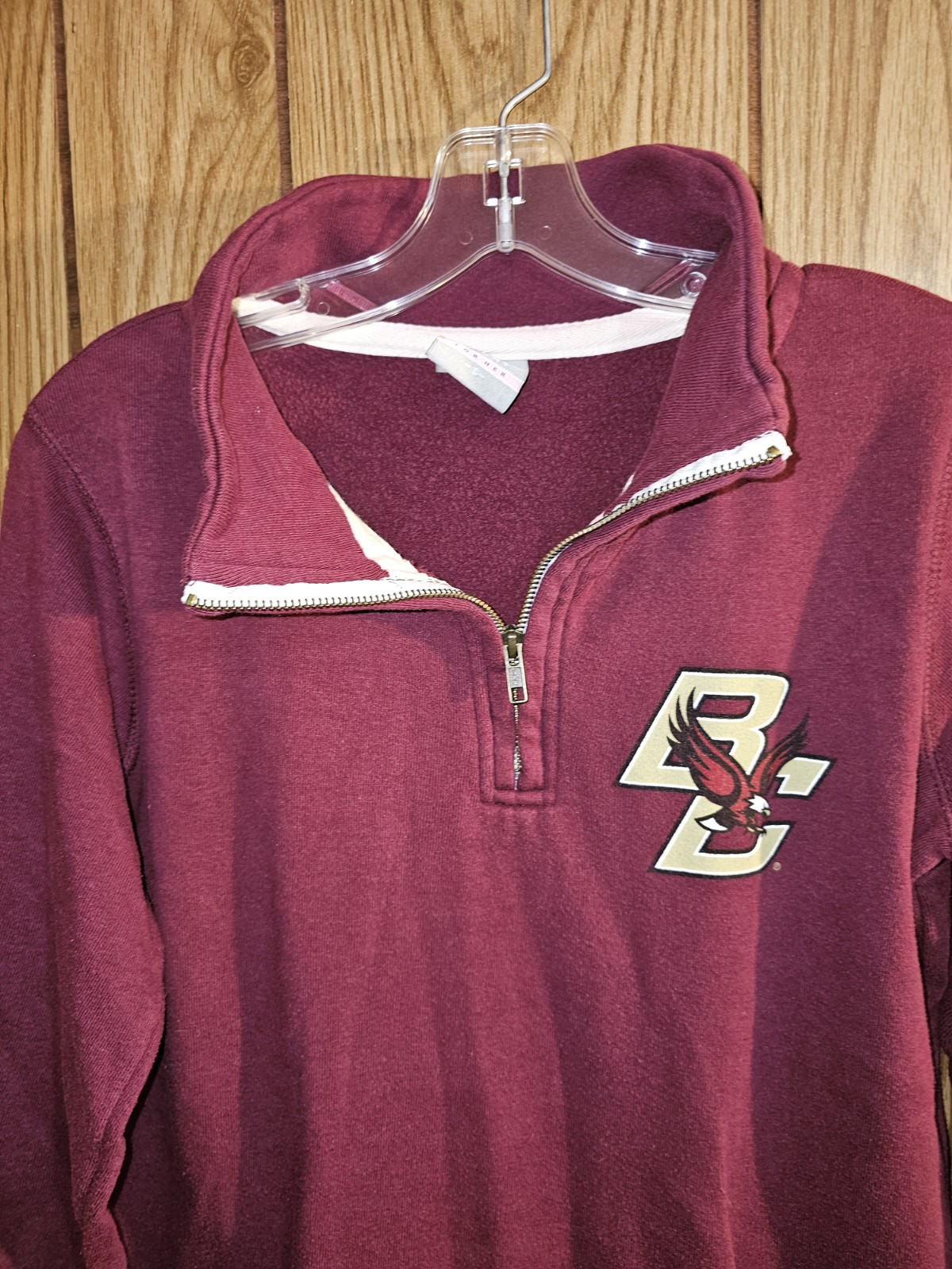This Boston College Eagles women's sweatshirt is a burgundy 1/4 zip pullover featuring a graphic logo. It is officially licensed NCAA fan apparel made by MV Sport. The sweatshirt is in size small, suitable for football fans during the regular season. Made in Pakistan, it is designed for female supporters of the Boston College Eagles.