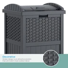Elevate your outdoor space while maintaining cleanliness with the Suncast 33 Outdoor Wicker Trash Can for Patio. Featuring a decorative wicker-style design, this porch trash can blends seamlessly into any patio, deck, or garden area, offering an attractive solution for waste management. Its 33-gallon capacity works with standard 30-gallon garbage bags, ensuring convenient and hassle-free usage. The hinged lid with a secure latch keeps garbage contained and deters pests, while its durable, weather-resistant resin construction provides protection against fading, cracking, and water damage. Measuring 16" W x 15.75" D x 31.7" H, this compact trash can delivers substantial storage without taking up too much space, making it an ideal addition to any outdoor setting. OUTDOOR PATIO TRASH CAN: Features a decorative wicker-inspired design that complements any outdoor setting, including patios, decks, and gardens, while effectively concealing waste HINGED LID WITH LATCH: The functional lid design provides easy access for garbage disposal and ensures it stays securely closed to keep contents out of sight and protect against pests and wind 30-GALLON CAPACITY: Accommodates standard 30-gallon garbage bags, making it simple to replace and maintain without the need for custom liners WEATHER-PROOF: Made from durable, weather-resistant resin that resists cracking, fading, and water damage, providing reliable use through all seasons and maintaining its attractive appearance SPACE-EFFICIENT DESIGN: Compact dimensions of 16" W x 15.75" D x 31.7" H offer generous 33-gallon capacity while minimizing the footprint, ideal for smaller outdoor spaces or high-traffic areas