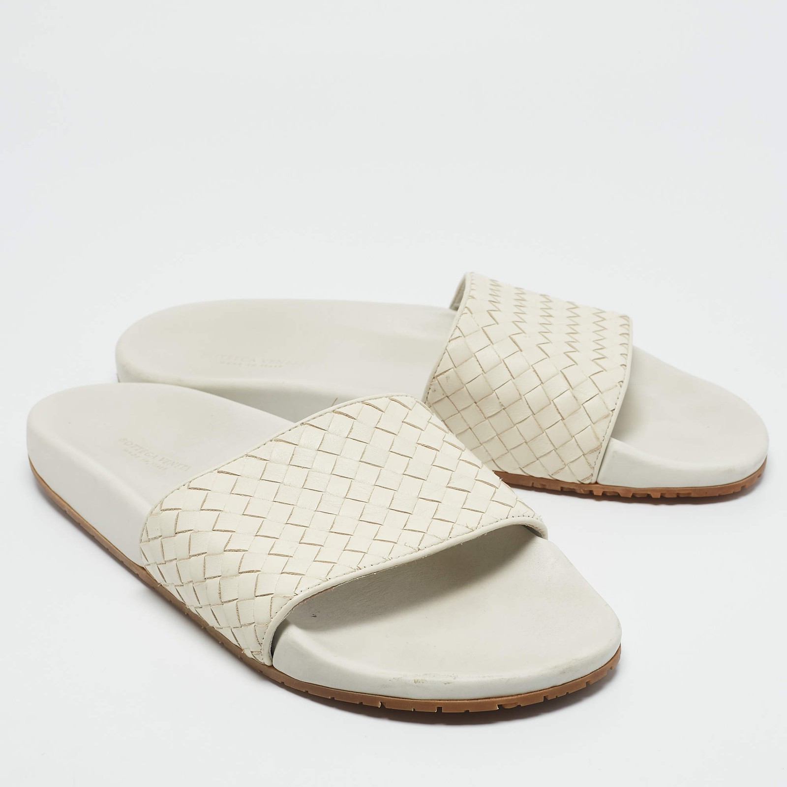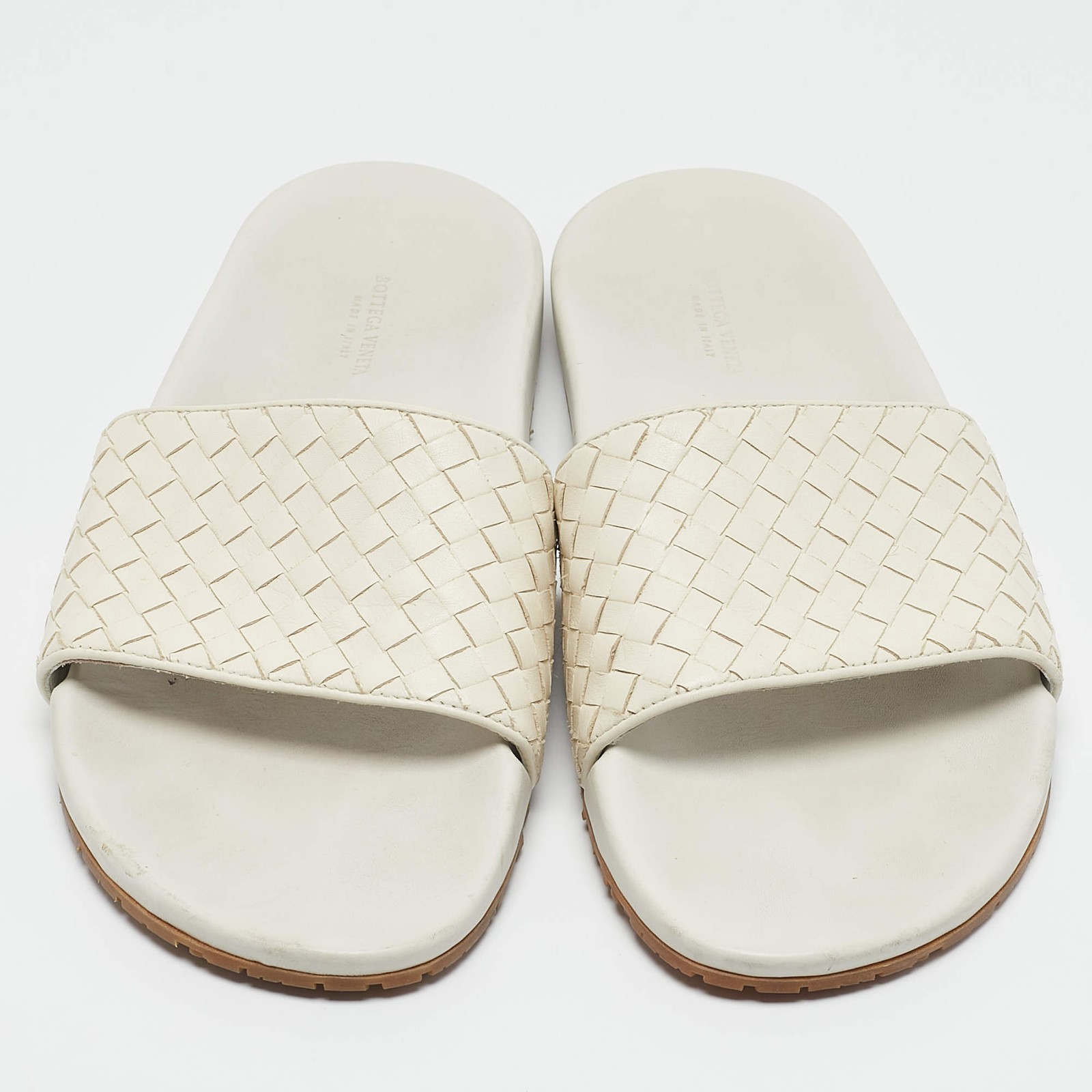 These sandals will frame your feet in an elegant manner. Crafted from quality materials, they display a classy design and comfortable insoles.Certified by The Luxury Closet - This item has gone through a detailed authentication process overseen by our experts. We offer a lifetime guarantee of authenticity on all our items. Import duties, taxes and charges are not included in the item price. These charges are the buyers responsibility. Please check with your country’s customs office to determine what these additional cost will be prior to buying. Our eBay Store About Us Contact Us Add to Favorite Sellers Bottega Veneta Cream Intrecciato Leather Lake Slide Sandals Size 45 $213.4 These sandals will frame your feet in an elegant manner. Crafted from quality materials, they display a classy design and comfortable insoles. Product Details Brand Color Cream Dimensions Material Intrecciato Leather Size 45 Outsole Width Outsole Length Heel Height Includes Certified by The Luxury Closet This item has gone through a detailed authentication process overseen by our experts. We offer a lifetime guarantee of authenticity on all our items. How We Check The in-house team of experts at The Luxury Closet is highly trained to verify the authenticity and the condition of the luxury products. They ensure that only 100% authentic items are put on sale.The evaluation process is unique with its own mix of assessment criteria and differs according to the category. Each item is evaluated based on the following combination of hallmarks, hardware, stitching, symmetry, material, craftsmanship, stamping, codes, hologram stickers, and packaging. Our authenticators also check if the items have been modified or amended (e.g., aftermarket diamonds, replaced batteries, repaired bags, etc.) International Buyers Import duties, taxes and charges are not included in the item price. These charges are the buyers responsibility. Please check with your country’s customs office to determine what these additional cost will be prior to buying.