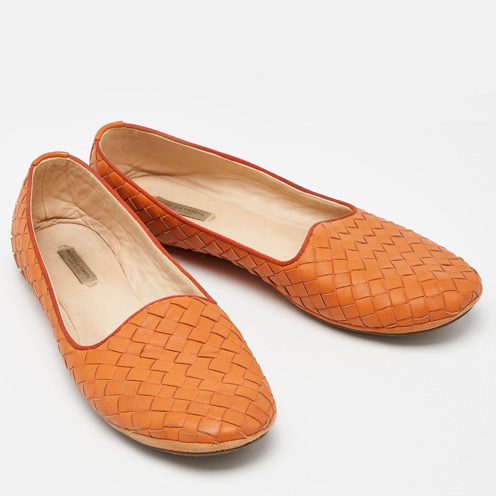 Our eBay Store About Us Contact Us Add to Favorite Sellers Bottega Veneta Orange Intrecciato Leather Ballet Flats Size 37.5 These classic ballet flats from Bottega Veneta will remain a favored pick. Created using orange Intrecciato leather for the exterior, they are supported by leather-lined insoles and durable soles. Product Details Brand Bottega Veneta Color Brown Includes The Luxury Closet Packaging Outsole Length 26.5 cm Outsole Width 7.5 cm Size 37.5 Certified by The Luxury Closet This item has gone through a detailed authentication process overseen by our experts. We offer a lifetime guarantee of authenticity on all our items. How We Check The in-house team of experts at The Luxury Closet is highly trained to verify the authenticity and the condition of the luxury products. They ensure that only 100% authentic items are put on sale.The evaluation process is unique with its own mix of assessment criteria and differs according to the category. Each item is evaluated based on the following combination of hallmarks, hardware, stitching, symmetry, material, craftsmanship, stamping, codes, hologram stickers, and packaging. Our authenticators also check if the items have been modified or amended (e.g., aftermarket diamonds, replaced batteries, repaired bags, etc.) International Buyers Import duties, taxes and charges are not included in the item price. These charges are the buyers responsibility. Please check with your country’s customs office to determine what these additional cost will be prior to buying.