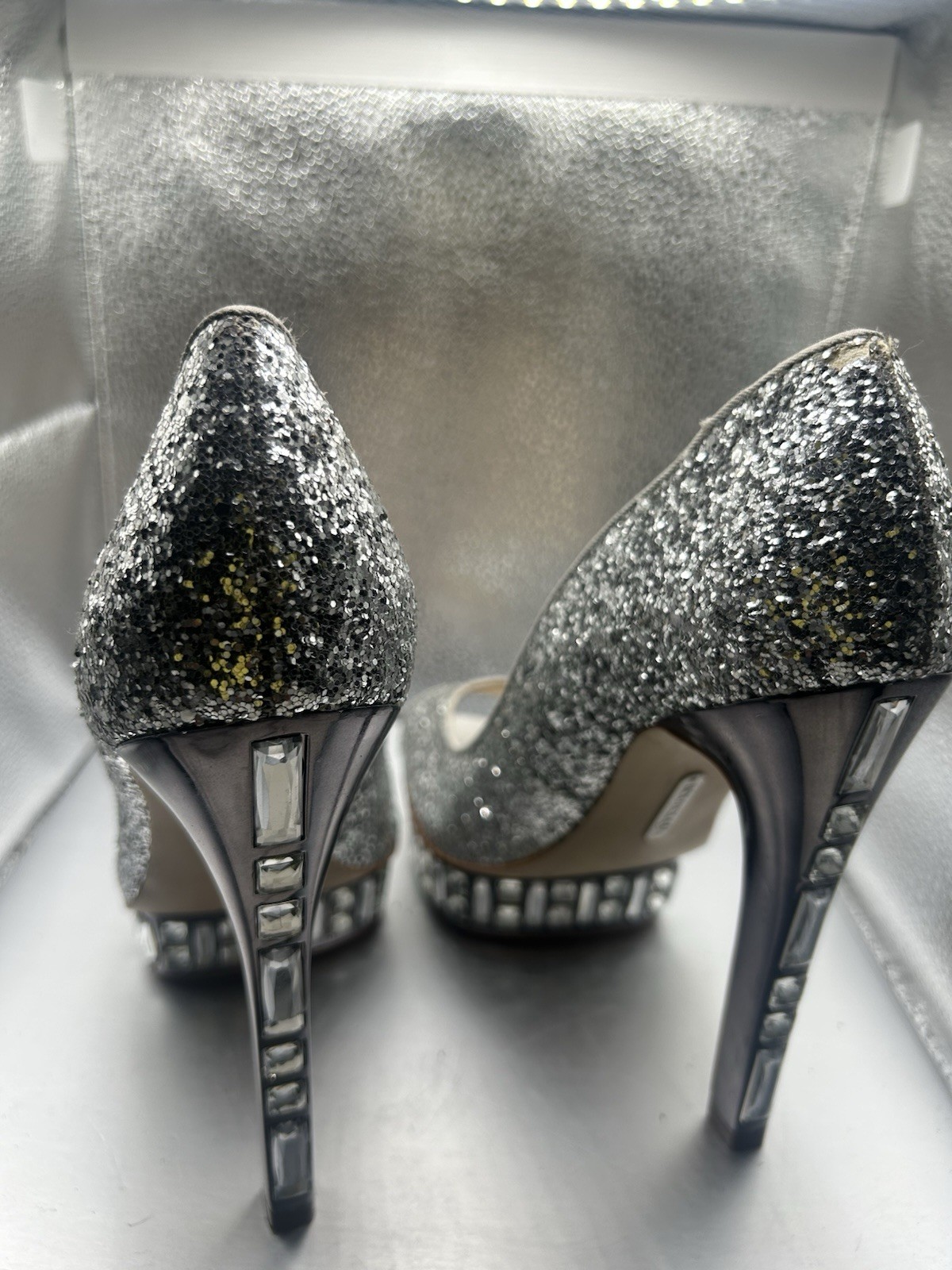 Crystal embellished peep toe pumps Size 9M silver rhinestone heels ∙ “Statement heels” ∙ “Wedding party shoes” ∙ “Gatsby/Art Deco style” ∙ “Formal occasion heels” ∙ “Sparkly platform pumps” ∙ “Nine West family Insoles show wear consistent with use - see photos Exterior in great shape with stunning crystal details Could be refreshed with insole inserts for added comfort Heel height (approximately 4.5-5”), platform height (approximately 1-1.5”)