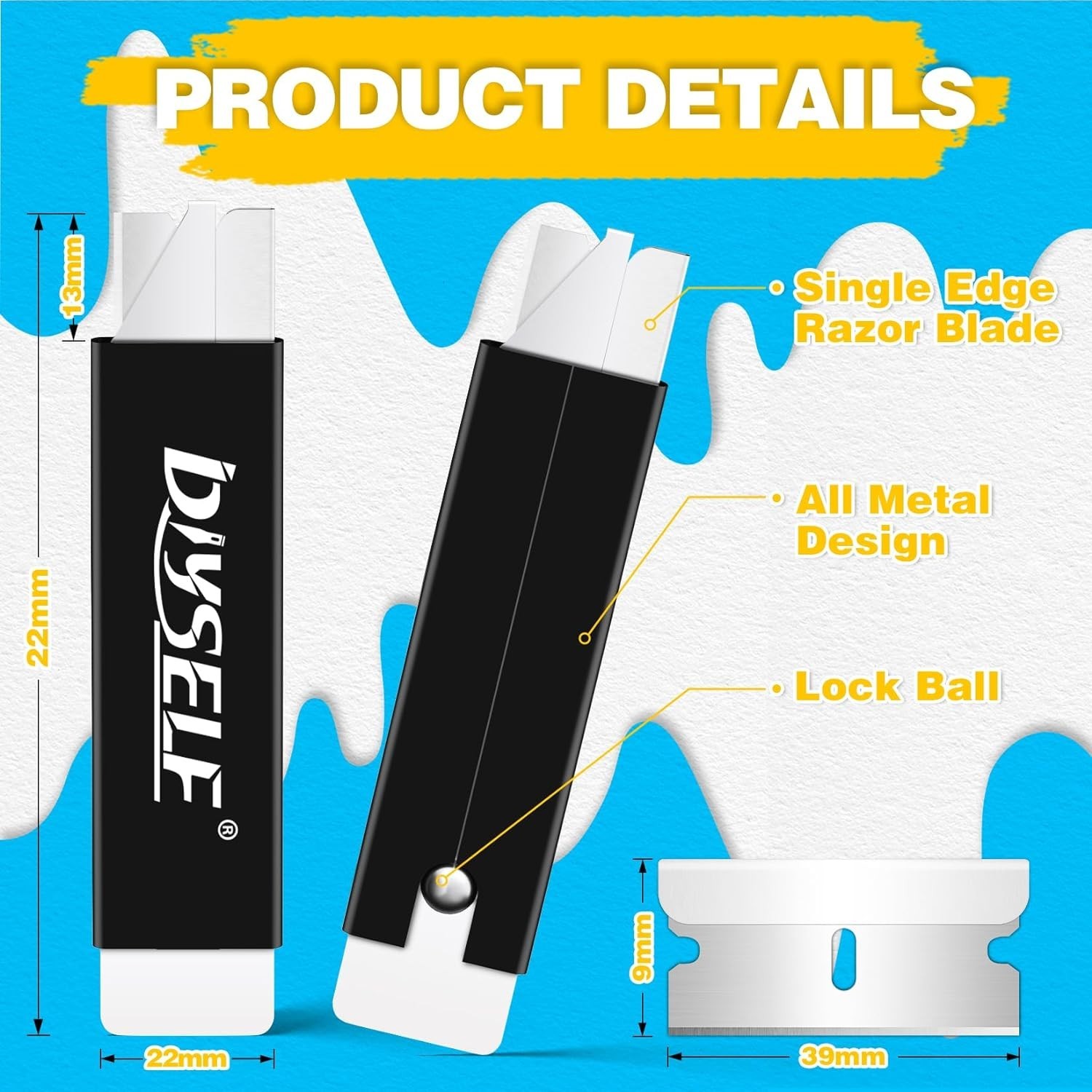 About this item VERSATILE SET OF 12 RAZOR BLADE KNIVES: Unleash the power of simplicity with our set of 12 razor blade knives, featuring an array of vibrant colors (red, yellow, pink, blue, black, orange). Each retractable knife is a compact powerhouse, combining functionality with a touch of style for various cutting tasks. ALUMINUM SHEATH FOR DURABILITY: The sheath of our box knife is crafted from durable aluminum, ensuring longevity and robust protection. This lightweight yet sturdy material adds a layer of resilience to your utility knives, making them ideal for various scenes, for example, office, school and warehouse. HIGH CARBON STEEL SINGLE EDGE BLADES: Embrace the cutting precision of high carbon steel single-edge blades. Engineered for sharpness and endurance, these utility knife blades effortlessly handle a variety of materials. Whether it's slicing through cardboard, plastic, vinyl, paper or tackling intricate projects, expect consistent performance with every cut. EFFORTLESS BLADE RETRACTION: Experience convenience at your fingertips with our easy-to-use box cutters. The blades retract seamlessly with a simple tap, providing a hassle-free and intuitive operation. This user-friendly design enhances efficiency and ensures a smooth cutting experience, making these cute box cutters the go-to choice for both beginners and seasoned users alike. TRANSFORMABLE INTO SCRAPERS: Elevate your cutting experience by seamlessly transforming these razor knives into razor scrapers. The blade's position is easily changeable, allowing you to adapt the tool to different tasks. From precision cutting to efficient scraping, this set is a versatile companion for your toolbox.