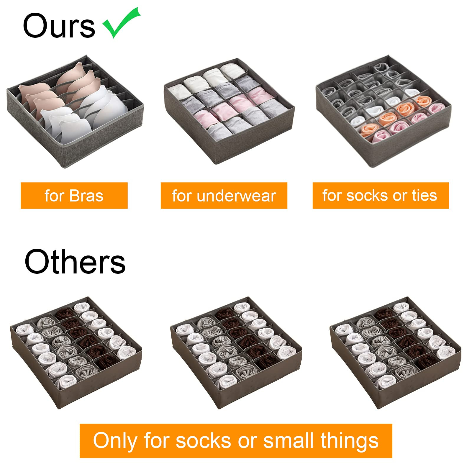 Friendly Design-- Bra, underwear, panties, socks, ties, leggings organizer for drawer, others only have socks organizer. High Quality: These underwear drawer organizers are made of durable oxford fabric and premium plastic board, much stronger than the non-woven fabric and cardboard. Time & Space Saving: The bra organizer bins for closet can be used to save space for your closet, drawer, wardrobe and cabinet, save much time on picking your items. Collapsible Drawer Organizers: Foldable design with a bottom zipper, the bra drawer organizer is very easy to set up and can be folded flat to save space when not in use. Decent size: 32 x 32 x 10 cm / 12.6 x 12.6 x 3.9 in, organizer boxes have great size to fit your socks, underwear and other items well.