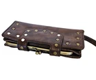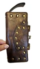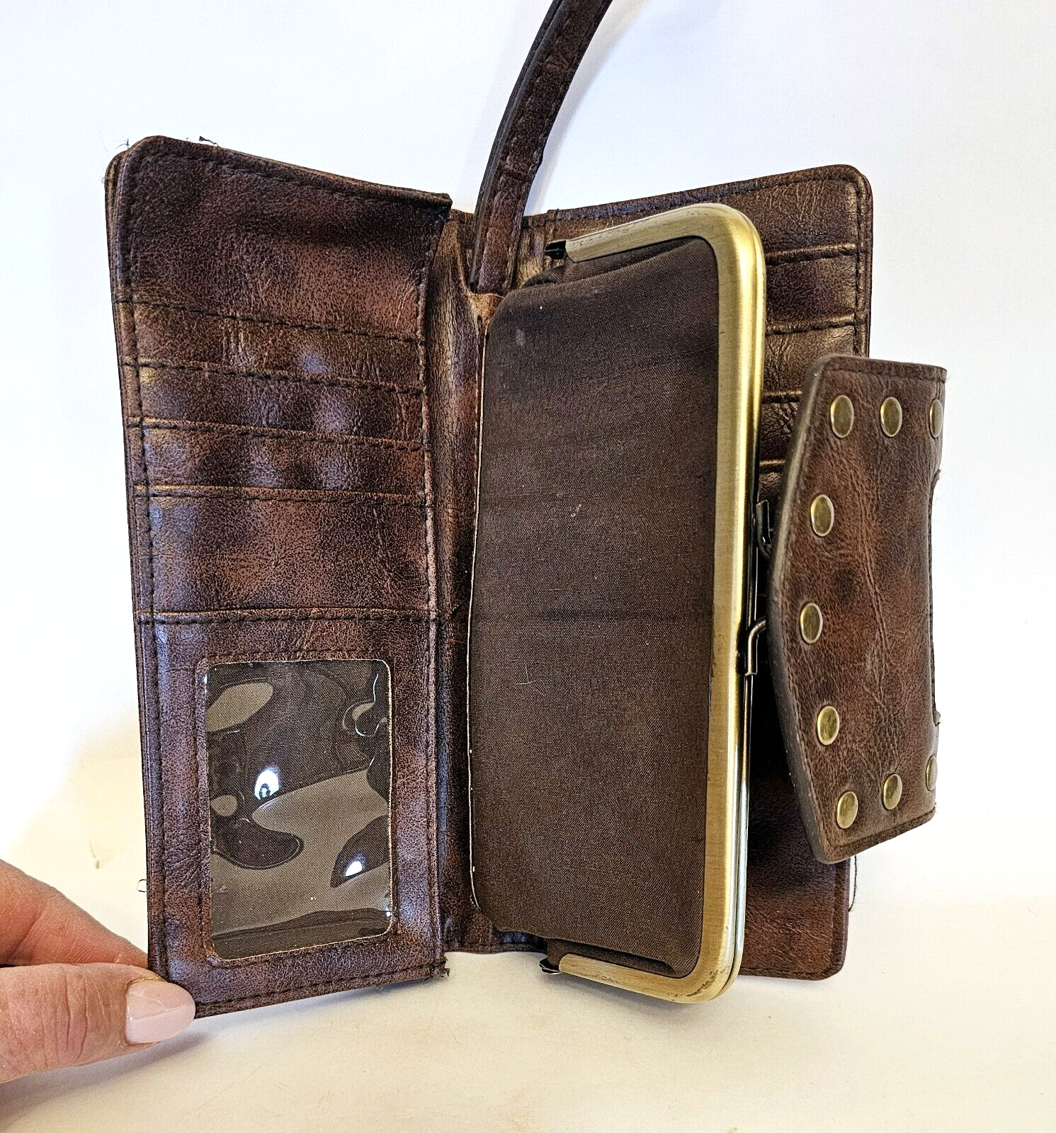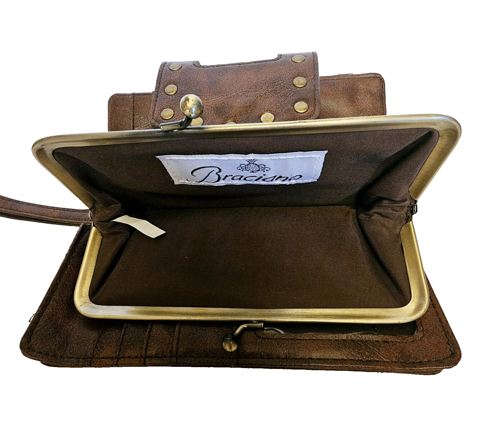 Braciano Brown Leather Wallet Wristlet w Studs Brads lots of Credit Card Slots Kiss Lock coin pouch. Very good condition!