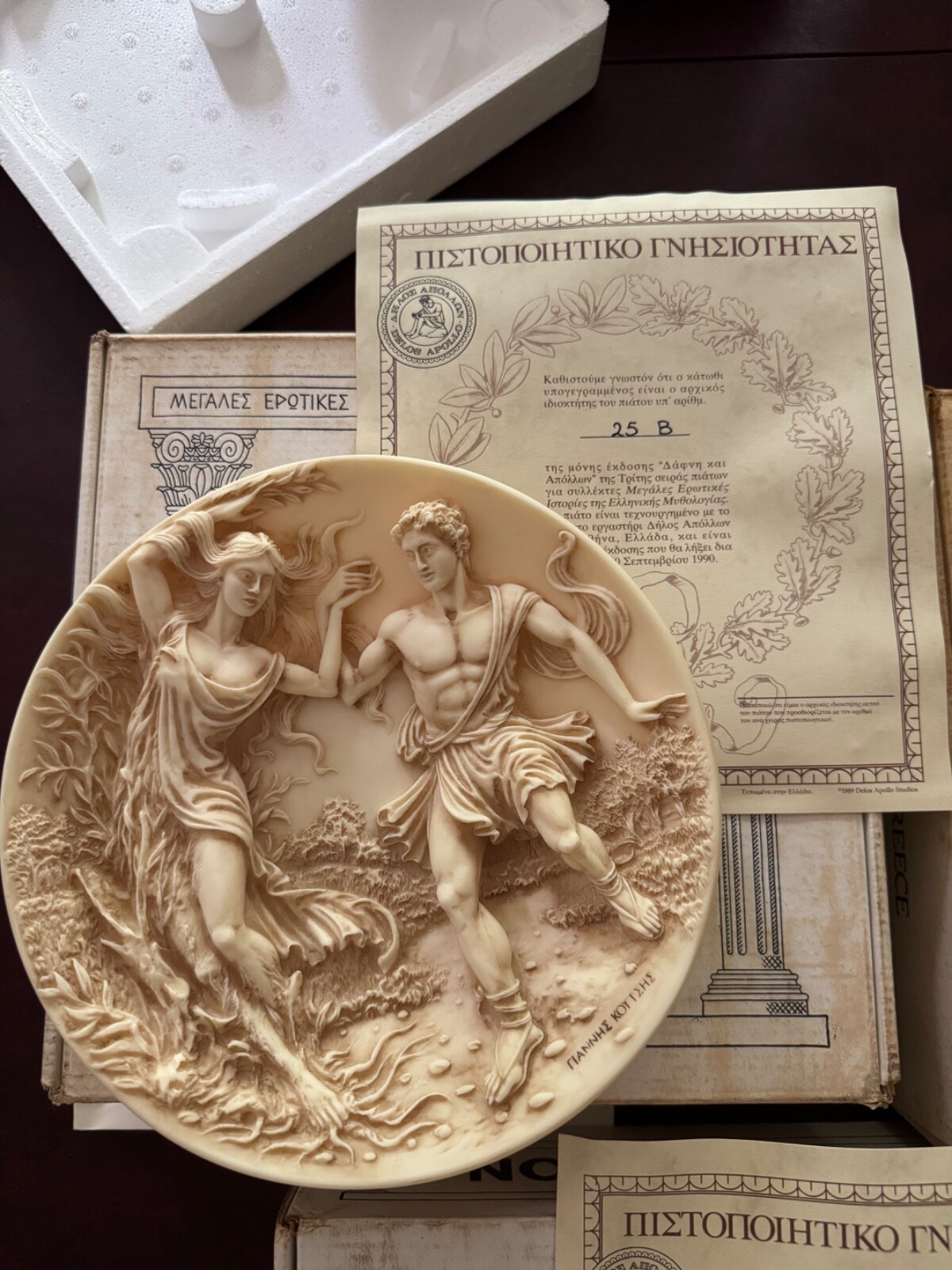 Absolutely stunning set of collector plates! The intricate Greek-inspired designs and elegant beige tones make them a perfect display piece. The marble-like material adds a touch of classic sophistication, and the 1980s art pottery vibe gives them a unique charm. A must-have for collectors who appreciate timeless craftsmanship and cultural artistry. Love how they elevate any space!