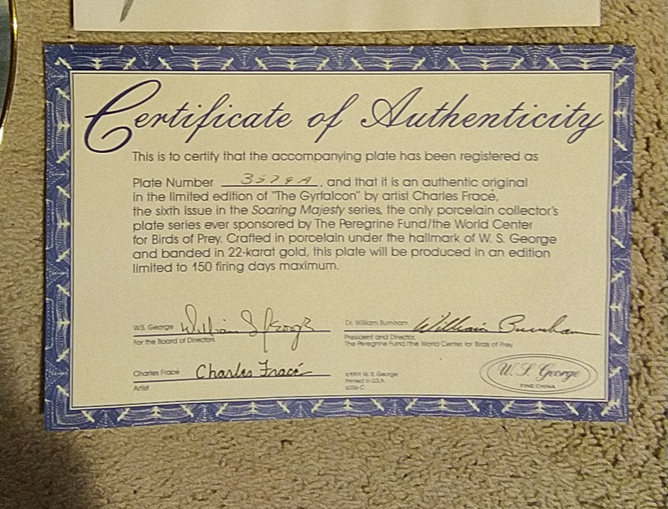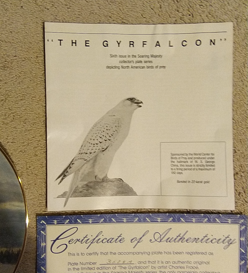 $ 5.19Bradford Exchange Peregrine Falcon Soaring Majesty Plate by Charles Frace 1991