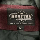 The Braetan Coat is a stylish and vintage women's jacket from the 1970s, featuring a unique colorblock design and a hood for added warmth. Made of wool with a colorblock geometric pattern, this long trench coat is lined with acetate and has a button closure. It is perfect for various occasions such as travel, parties, casual outings, workwear, and business meetings. The retro 70s/80s style and classic theme make it a timeless piece for the winter, fall, and spring seasons. Union Made in the USA, This Size 12 coat with a regular fit is a must-have for any woman's wardrobe.