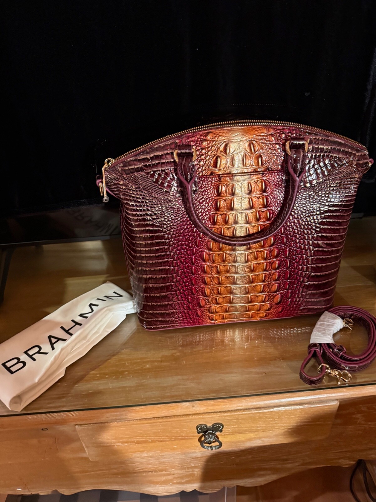 Elevate your style with the Brahmin Duxbury Melbourne Sunset Ombre Large Satchel. Crafted from luxurious leather, this exquisite bag showcases a stunning ombre pattern in a beautiful sunset hue, (A blend of Dark plum to lighter plum, to orange, to gold color complemented by elegant gold hardware. The spacious interior is lined with a soft beige fabric and includes a range of practical features such as inner pockets, a mobile phone pocket, and a zip-around closure to keep your essentials organized. This top handle bag boasts a detachable strap, allowing for versatile carrying options, and is adorned with eye-catching accents like a tassel, strap accent, and zipper detail. The Brahmin Duxbury is known for its superior craftsmanship and includes a certificate of authenticity, original dust bag, brand card, key holder, and bag charm. With its sophisticated design and premium construction, this satchel is a timeless accessory for any fashion-conscious woman. Tag included but not attached.