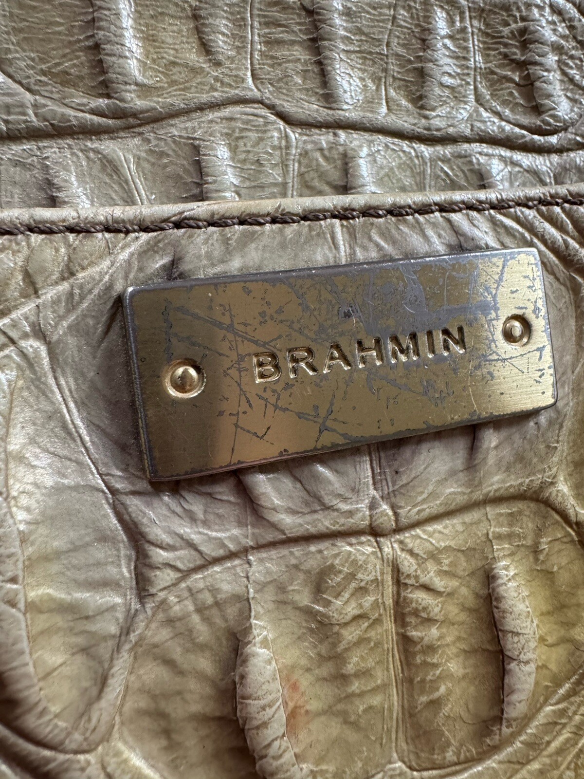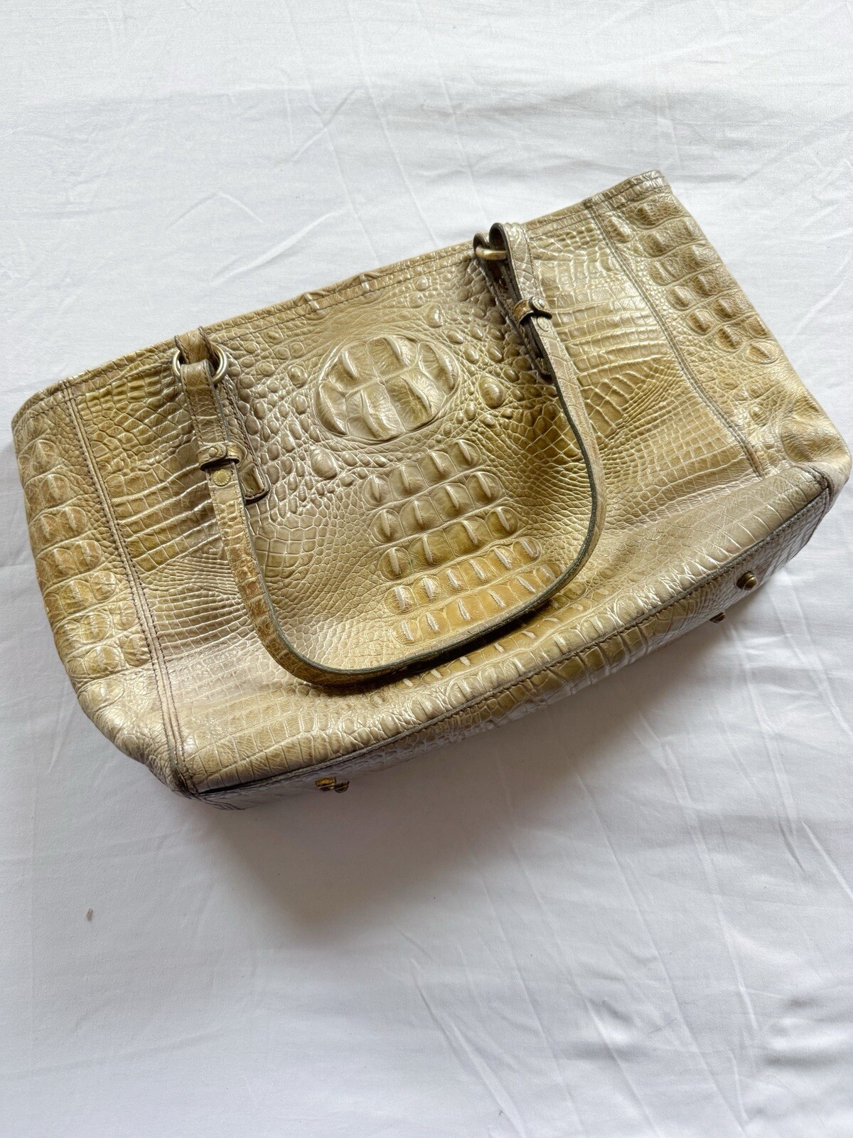 The Brahmin Medium ASHER Tan Melbourne Croc Leather Tote Purse is a stylish shoulder bag designed for women. Made of luxurious tan apricot croc-embossed leather with gold hardware accents, this medium-sized tote features a lined interior with multiple pockets. The bag has a classic design with a lizard print pattern and double leather handles. Bag is in good but used condition! Only flaws are some pen marks on the inside pocket