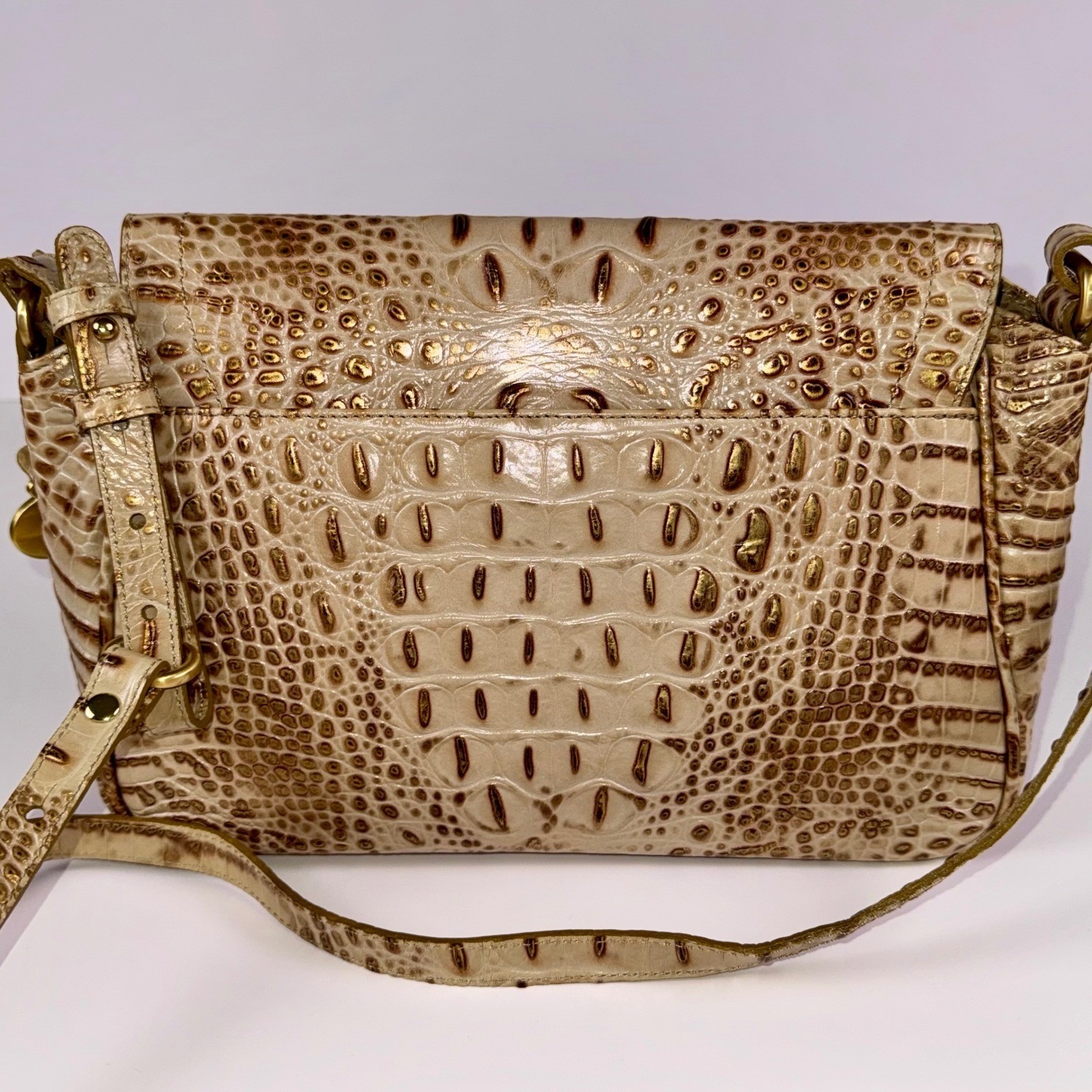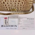 Authentic Brahmin Melbourne Helios crossbody bag in Champagne, purchased from Dillard's in 2011 and never used. Crafted from premium croc-embossed leather with a glossy finish, it features gold-tone hardware, a turn-lock flap closure, and an adjustable strap for crossbody or shoulder wear. Interior is fully lined in Brahmin logo fabric with multiple compartments, a zip pocket, and slip pockets for organized storage. Measurements approx: 10.5" W × 7" H × 3.5" D. Includes original Brahmin care card, Dillard's receipt, and price tags. Original retail $265. Condition is new with tags (NWT). Perfect for collectors or anyone seeking a high-quality luxury leather handbag. Keywords: brahmin melbourne, brahmin crossbody, designer bag, croc embossed leather, gold hardware purse, nwt handbag, luxury purse, brahmin satchel.
