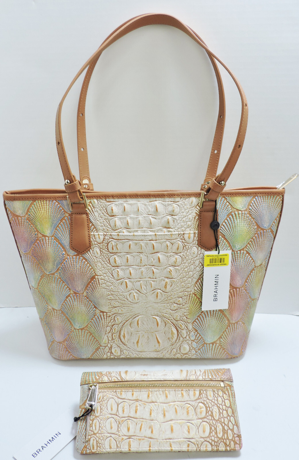 Brand New, With Tags, Never Been Used, Brahmin Medium Asher Scallop Bondi Satchel Embossed Leather & Ady Wallet. Multi Color Shell & Croc Embossed Leather, Smooth Leather Straps And Trim. Polished Gold Tone Hardware. Pocket On Back Of Bag. Interior is Brahmin Signature Lining With Two Utility Pockets Trimmed In leather With Zippered Pocket On Back Wall. Key Ring Holder On Leather Strip. Matching Ady Wallet With Gold Tone Logo Tag, Zippered Pocket On Back. Snap Closure Opens To 12 Credit Card Slots, Id Slot, Three Paper Money Slips. 7.5" W x 3.75" H x 1" D Registration & Dust Bag Included. Purchased from Dillard's Department Store. Must request RMA within 3 days of receipt of item. Item must be returned with all tags attached in unused condition with all materials returned to receive refund. Please View Store For More Great Styles ! Be sure to add me to your saved seller list ! Please ask all questions, read all details of listing or request more photos before bidding.