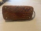 Crafted with the sophistication that Brahmin is renowned for, this Melbourne satchel epitomizes luxurious style with its lustrous pecan alligator leather exterior. The Duxbury line bag combines functionality with elegance, featuring a medium size that's perfect for everyday use. It boasts a rich brown lining that complements the exterior's warm hues, and gold hardware that adds a touch of refined detail. The bag's dimensions, 11 inches in width, 10 inches in height, and 7 inches in depth, provide ample space for your essentials. A secure zip closure keeps your belongings safe, while the adjustable strap and top handle offer versatile carrying options. This piece is a testament to the timeless appeal and quality craftsmanship of Brahmin handbags. There are minor defects due to wear.