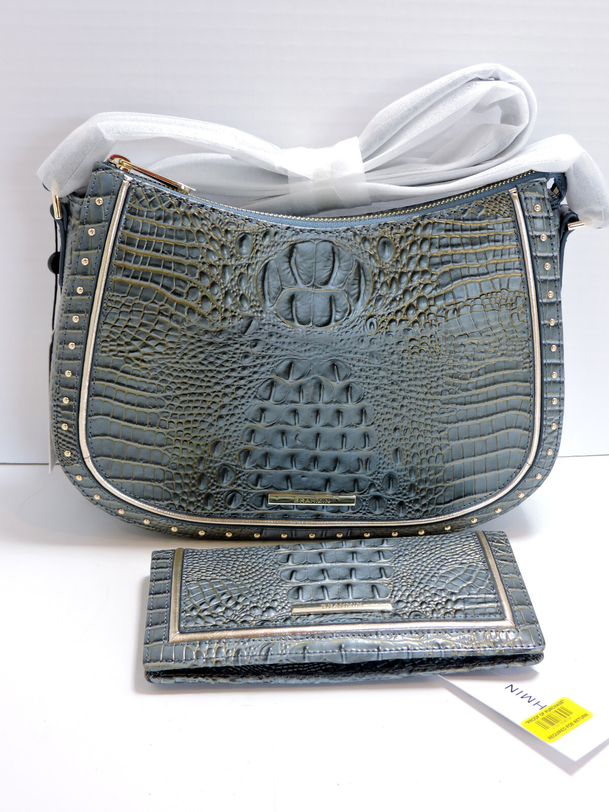 New With Tag, Never Used! Brahmin Shayna Slate Stratos Mini Melbourne Leather Cross Body. Teal Mini Melbourne Leather With Smooth Gold Trim & Studs. Gold Tone Hardware, Zipper Closure, With Slide In Pocket Along Back Of Purse. Interior Is Signature Material With One Leather Pull Zipper Pocket And One Utility Pocket With Pen Slip. Brahmin Slate Stratos Ady Wallet 11 Credit Business Card Slots, 1 Clear ID Window 3 Full Length Paper Money Compartments, Zipper Pocket On Back Of Wallet. Registration Card And Dust Bag Included. Pictures Taken With And Without Flash. Monitors May Vary Color. Purchased from Dillard's Department Store. Please View Store For More Great Styles. Be sure to add me to your saved seller list ! Must Contact Within 3 Days Of Receipt For RMA To Return. Must Be Returned In Exact Condition As Received, All Tags Attached, Unused With All Materials. Please ask all questions, read all details of listing or request more photos before bidding.