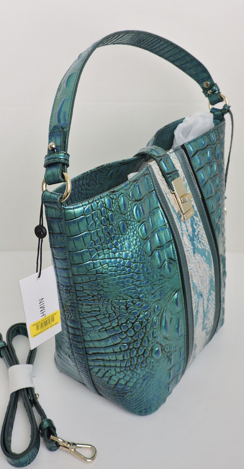 Brand New, With Tags, Never Brahmin Shira Peacock Shimmer Croc & Snake Embossed Leather Tote With Ady Wallet. The Shira is a modern bucket bag with practical details. A stylish turn-lock closure keeps your necessities secure, while a magnetic back slide-in pocket ensures your phone will stay in place. Various interior compartments offer plenty of storage for your essentials. Carry by the short strap or as a crossbody with the adjustable secondary strap. Mesmerized Ady Wallet. OPENS TO 12 CREDIT CARD SLOTS, 1 ID SLOT WITH PAPER MONEY SLIP UNDER THESE CREDIT CARD SLOTS. 7.75" W x 3.75" H x .75" D Purchased from Dillard's & Brahmin Store. Please View My Store For More Great Styles. Be sure to add me to your saved seller list ! Must Contact Within 3 Days Of Receipt For RMA To Return. All Tags Must Be Attached, In Unused Condition With All Materials Received For Refund. Please ask all questions, read all details of listing or request more photos before bidding.
