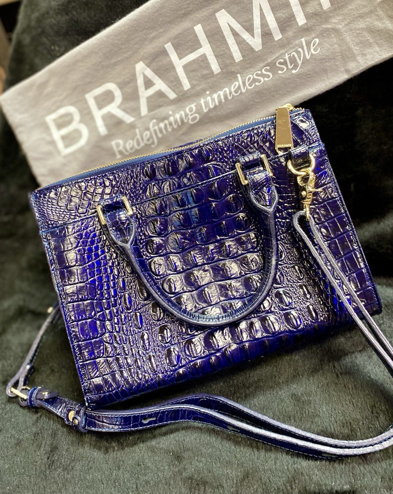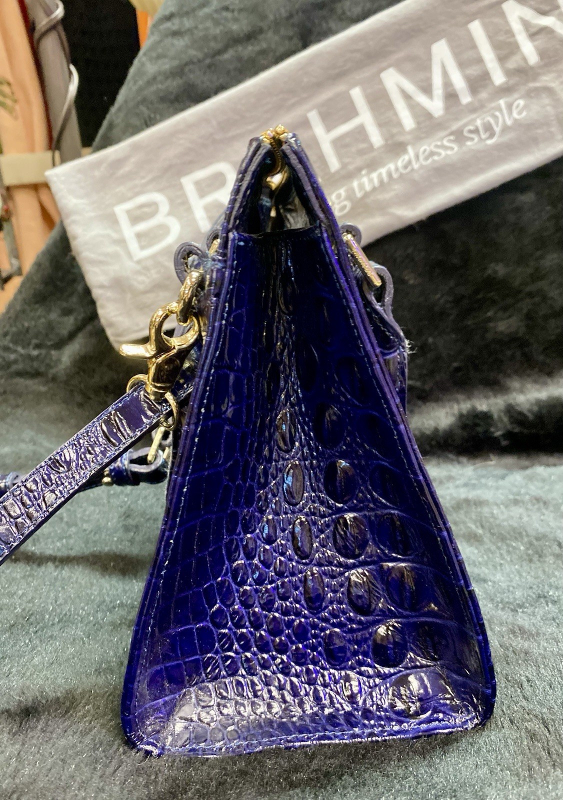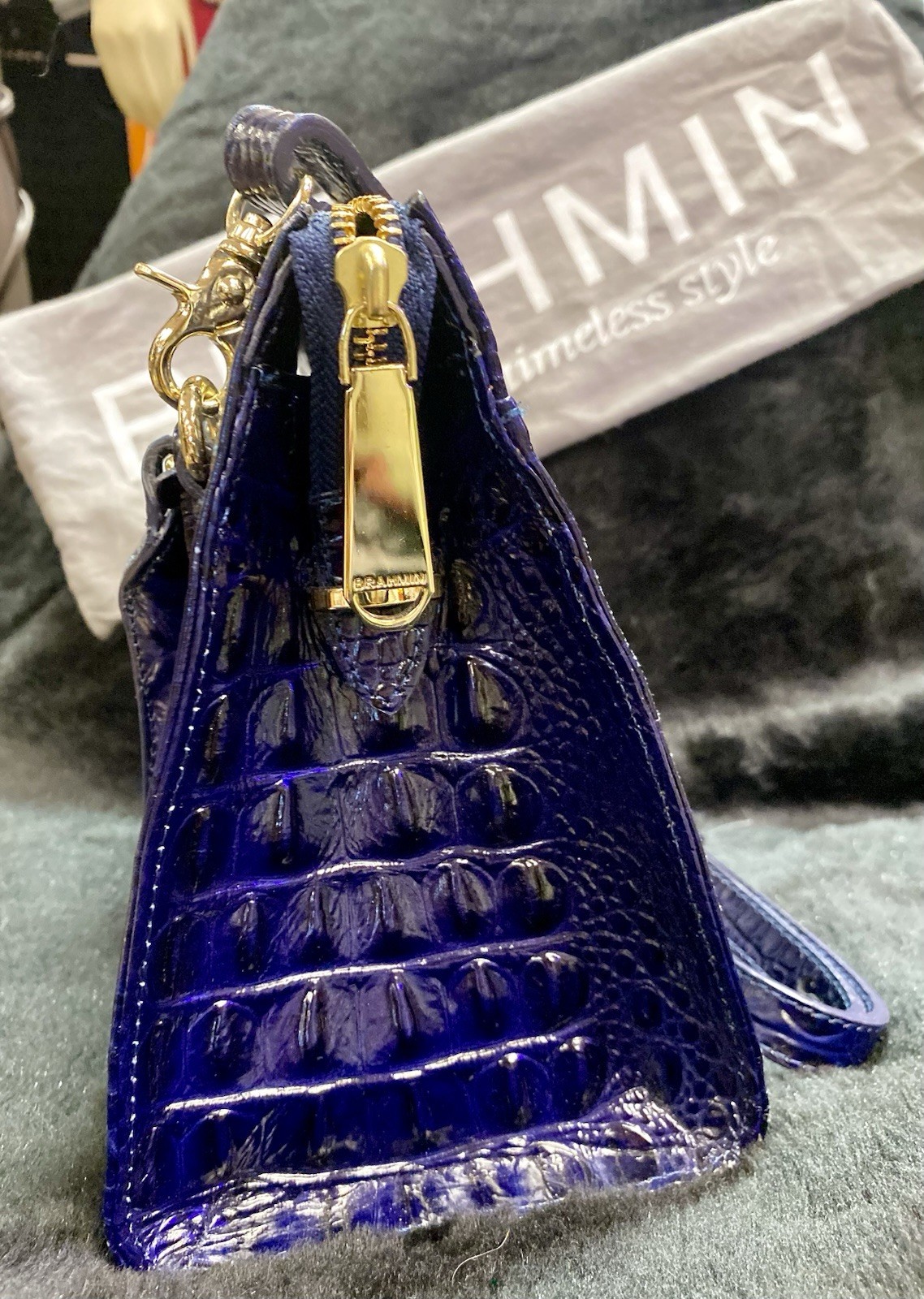 This Brahmin satchel is absolutely stunning! The ultraviolet ombre leather is rich and eye-catching, with gorgeous gold hardware and croc embossing. The double rolled handles and adjustable strap make it super versatile, while the interior is spacious with plenty of pockets. The matching wallet is a perfect touch—love the card slots and zippered pocket. Feels luxurious and brand new, plus the dust bag is a nice bonus. A must-have for any handbag lover!