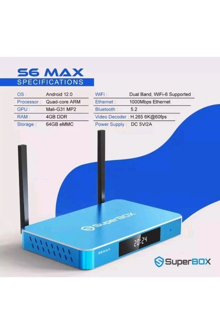 Generation: 6th Generation Connectivity: Ethernet Port, HDMI, HDMI Port, Memory Card Slot, USB Port, Wi-Fi, Bluetooth Year Manufactured: 2025 Audio/Video Outputs: HDMI Model: S6 Max Surround Sound Formats: Dolby Digital Color: Blue gtin13: 715787209545 Storage Capacity: 64 GB Features: Wi-Fi Maximum Resolution: 2160p Manufacturer Warranty: 1 Year Processor: Quad Core Type: Tv Box Operating System: Android Brand: SuperBox UPC: 715787209545 Country/Region of Manufacture: China Product Line: SuperBox MPN: S6 Max