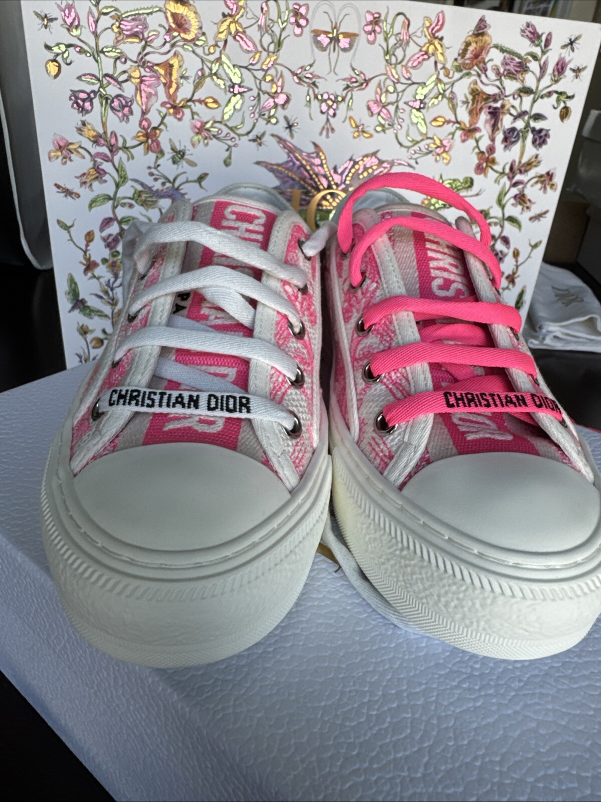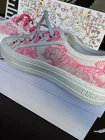 100% AUTHENTIC CHRISTIAN DIOR AUTHENTIC CHRISTIAN DIOR BRAND NEW in DIOR BOX & 2 DUST BAGS Color: White & Pink COMES with shoe Box, Dior card & DIOR 2 dust bags Size: 36.5 Made in Italy Retail: $990 Elegant and timeless DIOR Sneakers Made in Italy Walk'N'Dior Sneaker in pink and white embroidered canvas and silver-tone hardware with logo printed laces Lace-up closure Lightly padded insole Rubber sole with traction
