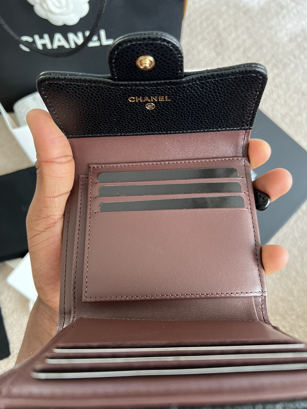 Chanel Caviar Skin Classic Small Flap Trifold Wallet Black / Brand : Chanel Wallets Type : Wallet (tri-fold) Gender : Women Material Fashion : Caviar leather Color Cases : Black Size Hxwxd Cm : 11cm x 11.5cm x 1.5cm / 4.33'' x 4.52'' x 0.59'' Width Cm : 11.5 Depth Cm : 1.5 Wallet Accessories : Box, Dust bag Accessories