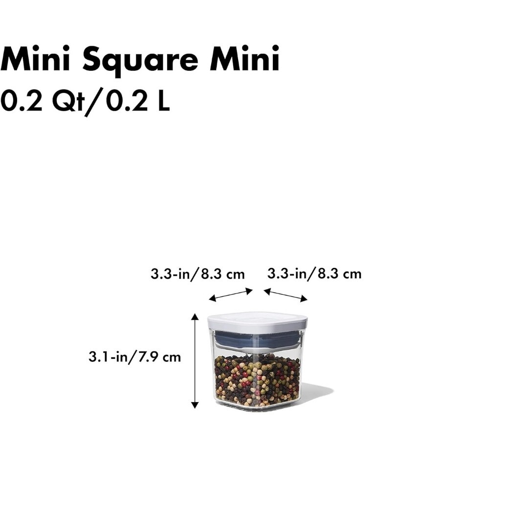 Shape:SquareItem Height:Does Not ApplyModel:OXO Good GripsBrand:OXOColor:ClearType:Mini Pop Container SetFeatures:Airtight, BPA Free, Dishwasher SafeItem Width:Does Not ApplyNumber of Items in Set:4Item Length:4 in