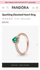 Add a sophisticated touch to your look with the Sparkling Elevated Heart Ring. The ring draws inspiration from the classic Pandora Timeless collection. Hand-finished in 14k rose gold unique metal blend, this piece features a green heart-shaped central, elevated stone. Clear cubic zirconia create the halo and decorate half of the ring band, with the Pandora logo inside the shank. Stack this ring with hand-finished styles in sterling silver for a statement mixed metal look. Collection Pandora Timeless Color Green Product Type Rings Item 188421C03 Metal 14k Rose gold-plated unique metal blend Material No Other Material Dimensions Depth: 5.1 mm Height: 8.4 mm Width: 8.2 mm