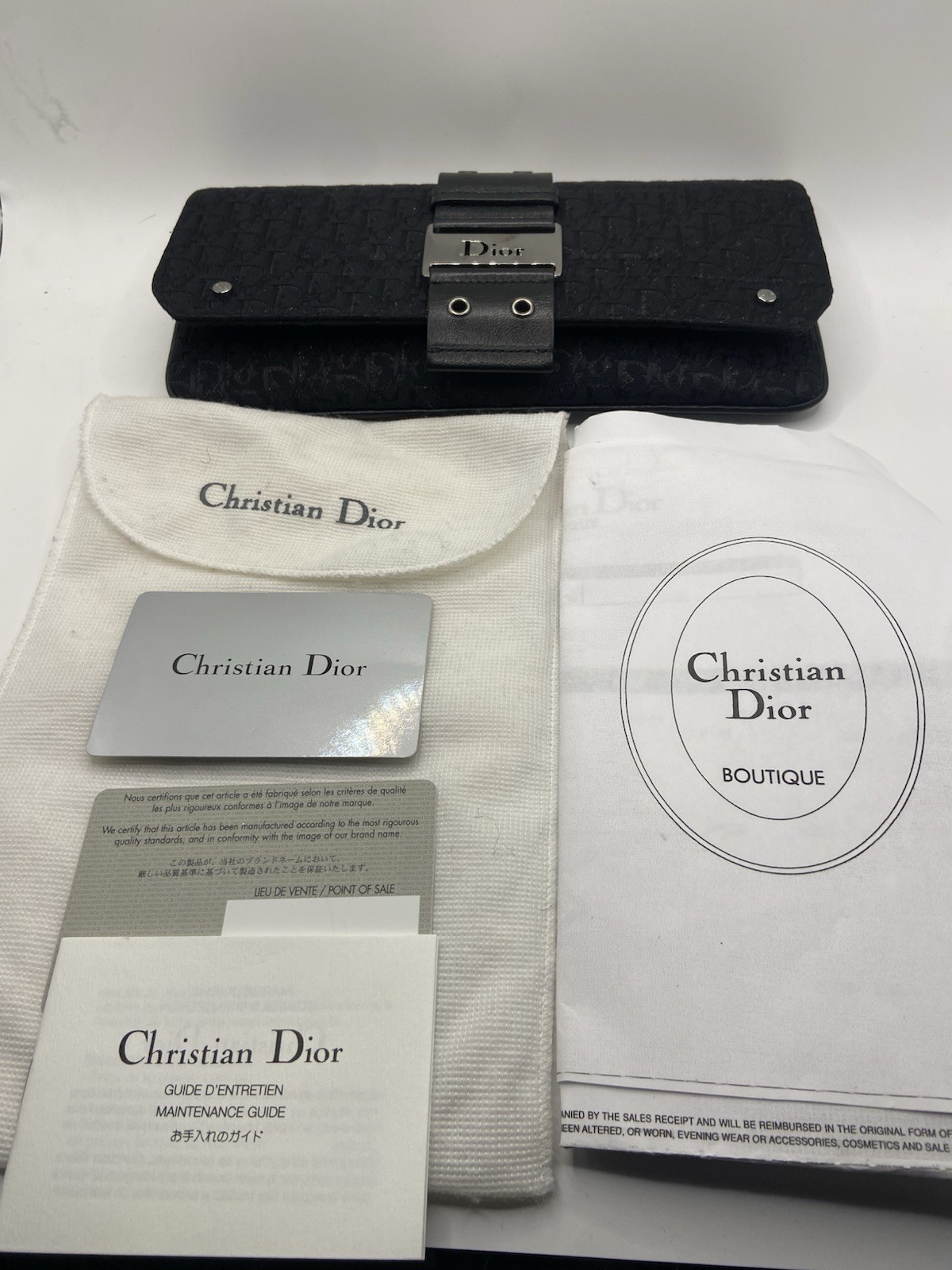The Brand New Vintage Dior Black Monogram Evening Bag is a stylish and luxurious accessory for women. Made from a combination of canvas and leather, this rectangular shaped bag features a magnetic closure and removable black shoulder strap handle. The exterior is adorned with the iconic Dior monogram logo and buckle accent, adding a touch of elegance. The black fabric lining provides a sleek contrast to the silver hardware, making this bag a chic and versatile choice for any evening outing. Complete with a dust bag, brand card, and maintenance guide, this Dior bag exudes sophistication and timeless style.