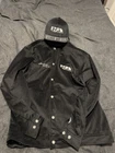 The brand new Black certified diamond dealer jacket with Matching black hat is a stylish and versatile outerwear set designed for men. Made of polyester, the jacket features a snap closure, collared style, and mid-length fit. The jacket is adorned with button, beaded, embroidered, and logo accents, adding a unique touch to the design. Suitable for all seasons, this limited edition jacket is perfect for various occasions such as travel, parties, or casual wear. The set exudes a designer theme, making it a standout addition to any wardrobe.