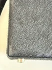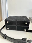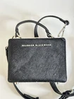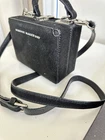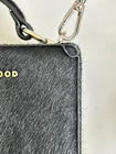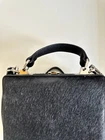 The Brandon Blackwood "Kendrick" trunk style top handle bag is a mini-sized crossbody bag crafted from black pony hair with an animal print pattern. It features a catch fastener closure, a detachable strap, and silver hardware accents. The bag has a sleek black canvas lining, making it suitable for unisex adults looking for a unique and stylish accessory. Perfect for those seeking a statement piece with a luxurious touch, this Brandon Blackwood bag exudes a contemporary and edgy vibe with its pony hair exterior and compact design.