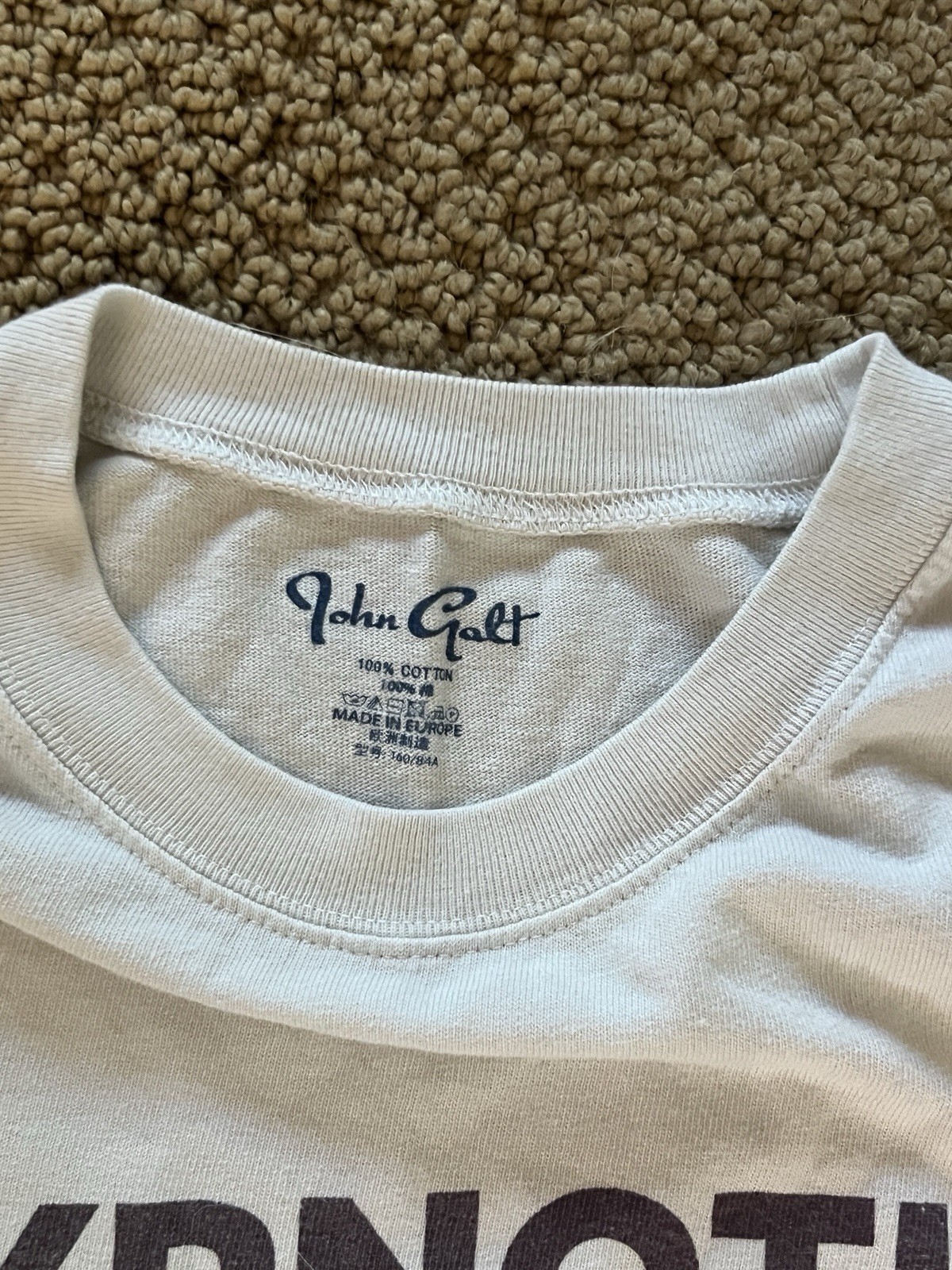 The Brandy Melville John Galt Hypnotic Graphic Cut Off Tee is a stylish women's crop top t-shirt featuring a cropped style with a white color and a hypnotic graphic design. This one size top is designed for regular sizing and is perfect for those looking for a trendy and unique addition to their wardrobe. The Brandy Melville brand is known for its quality and edgy designs, making this tee a standout piece for any fashion-forward woman.