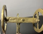 The product is a 7.5" tall Etruscan horse chariot sculpture, appears to be brass adorned with intricate details depicting a Greek warrior riding on the back of a horse holding an owl. In the style of F Weinberg The sculpture is a representation of ancient artistry and craftsmanship, showcasing a blend of realism and stylization typical of Etruscan and Greek sculptures. , this sculpture captures the essence of the Classical period with its depiction of the horse and warrior figure, making it a unique and visually striking piece for any art collection.