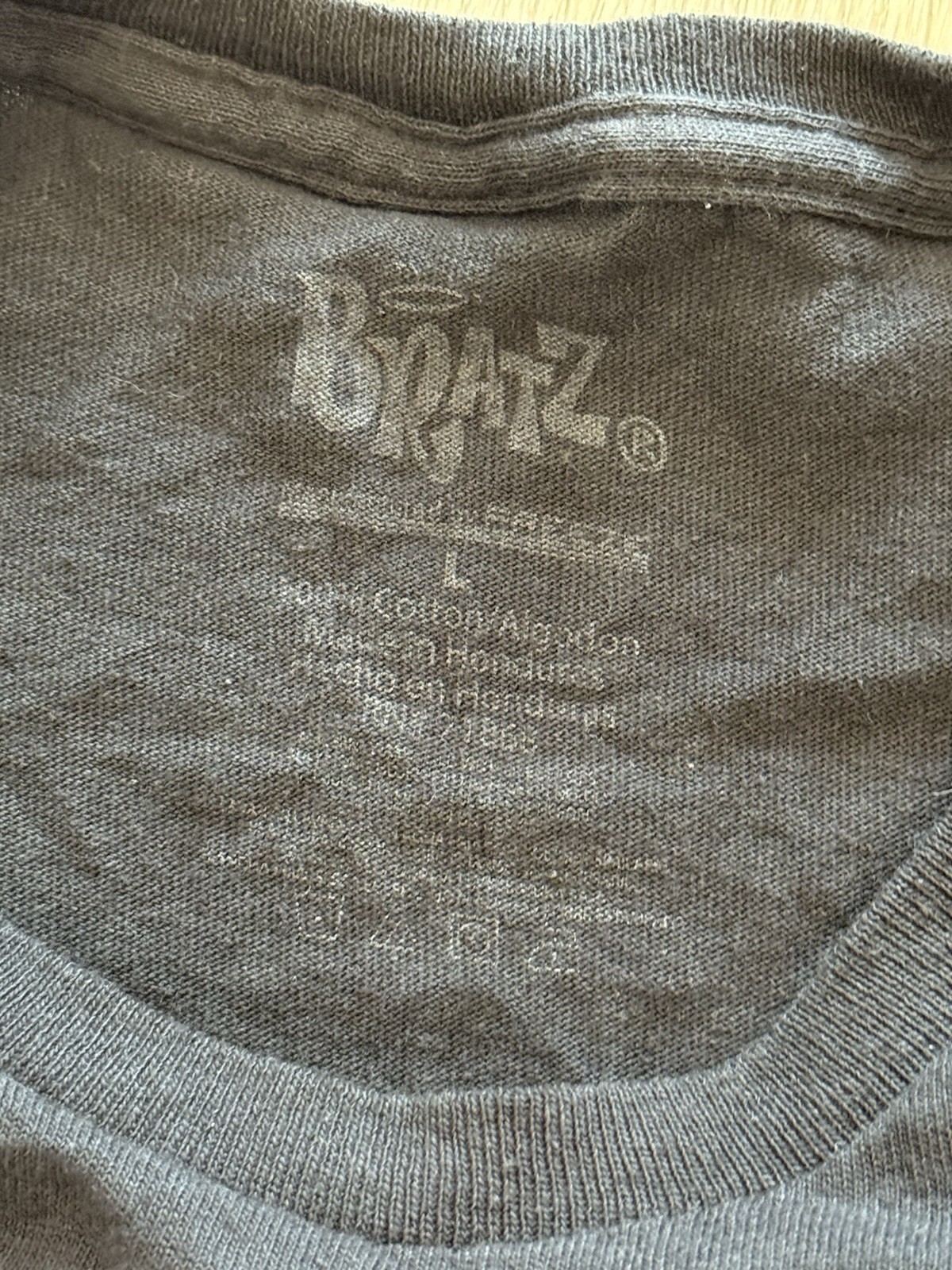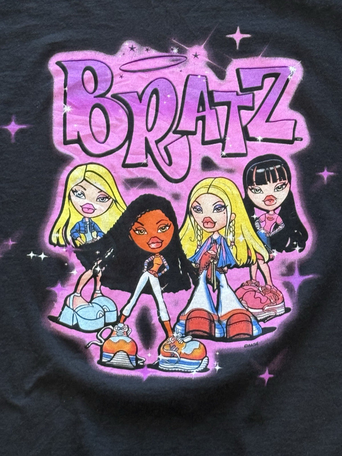 The MGA Bratz Dolls Licensed Short Sleeve Graphic Print Top T-Shirt in women's size L is a stylish and comfortable clothing item perfect for casual occasions. Made of 100% cotton knit fabric, this black t-shirt features a crew neck, pullover closure, and a Bratz logo accent. With a regular fit and tagless design, this basic t-shirt is suitable for all seasons and can be easily styled with the character theme of Bratz dolls, adding a touch of rock and cartoon flair to any outfit. Easy to care for with machine washable instructions, this t-shirt is a must-have for any fan of the Bratz franchise.