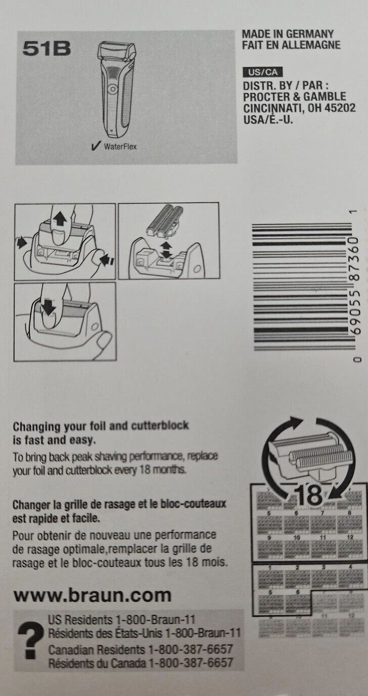 Compatible with: For Braun 5 Series (Type 5751) Models: 590cc-4, 590cc-3, 590cc, 570cc-4, 570cc-3, 570cc, 560s-4, 560s-3, 560, 550s-4, 550s-3, 550, 540, 530s-4, 8385 C&R, 8377, 8374. For Braun 360° Complete (Types 5649, 5647, 5646) Models: 8995, 8991, 8990, 8987, 8986, 8985, 8975, 8970, 590cc, 570cc, 550, 540. For Braun Activator (Types 5645, 5644, 5643) Models: 8795, 8790, 8785, 8783, 8781, 8595, 8590, 8588, 8585, 8583, 8581. Features: -100% brand new and high quality. -It's easy to install. -Clean the razor before installation. -Please make sure well your razor model. Package includes: 1 x foil 1 x cutter