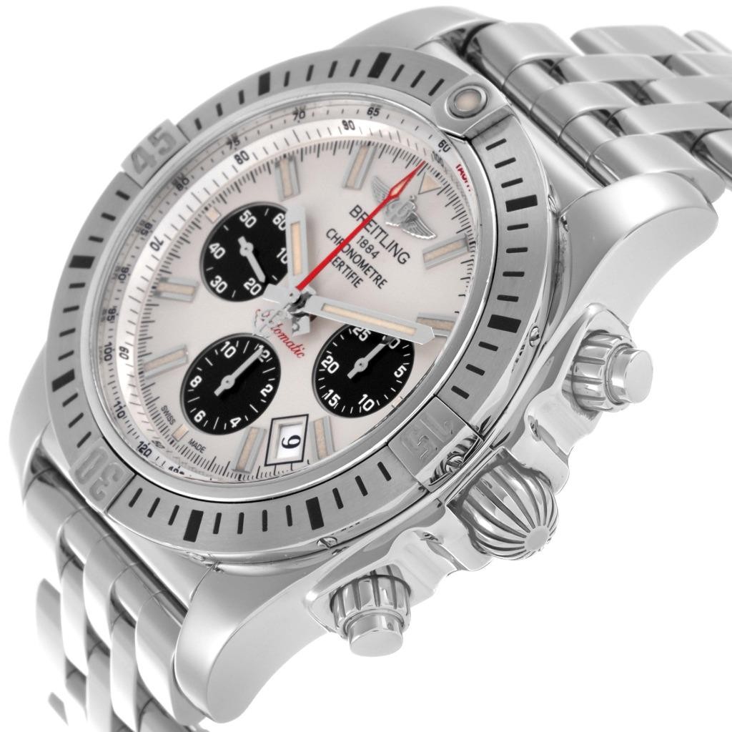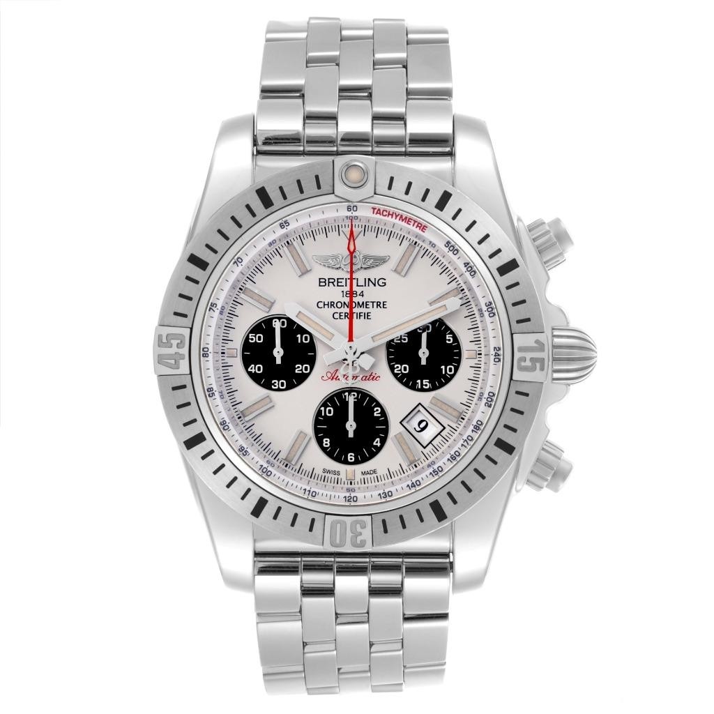 Breitling Chronomat 44 Airbourne Silver Dial Steel Mens Watch AB0115 Breitling Chronomat 44 Airbourne Silver Dial Steel Mens Watch AB0115 Click image to enlarge Description Swiss Watch Expo (404) 814-1814 Model number AB0115 Stock number 65745 Serial number 316xxxx Year 2014 Gender Mens Movement Self-winding automatic officially certified chronometer movement. Chronograph function. Case Stainless steel case 44.0 mm in diameter. Crystal Scratch resistant sapphire crystal. Dial Silver dial with luminous baton hour markers. Date aperture between 4 and 5 o'clock. Baton luminous hands. Three black Chronograph sub-dials -- 60 second, 30 minute and 12 hour. Bezel Stainless steel unidirectional rotating bezel. 0-60 elapsed-time. Four 15 minute markers. Bracelet Stainless steel bracelet with flip-lock clasp. Fits 7 3/4" wrist. Condition Excellent condition. Engravings None Box & papers Presentation non-Breitling box. Authenticity 100% authentic Working condition Timed to precision on Witschi watch expert timing machine. Running strong and keeping the accurate time. Warranty The watch is covered by Swiss Watch Expo one year warranty on anything but abuse Pictures All the photos are of the actual watch for sale Payment - We ONLY accept payments in United States Dollars (USD). - Payments must be made within 5 days of winning the auction. Shipping Shipping Methods All shipments are sent fully insured, using the following carrier methods: * Domestic - UPS. * International - No international shipping available Terms of Sale 18 month Limited Warranty Swiss Watch Expo is honored to have the opportunity to serve you. That's why we stand by all of our products with a full 18 month limited warranty. If an item we sell you should fail as a result of a manufacturer's defect at any time during the first year and a half , we will repair or replace the item at absolutely no cost to you. Not covered by warranty: - Regular wear-and-tear from normal use. - External damage to the product. Any damages resulting from wear to the watch case, crystal/glass, watch bracelet, watch bezel, straps, screws, crown/stem, finishes, clasps/buckles, or any other physical damage to the watch. - defects caused by outside force or improper use. Consequential and incidental damages. - the loss of precious, semi-precious stones from settings. - Outside modifications and third party repair attempts of any kind will void the warranty. - Any damage if used under conditions which exceed the watch manufacturer?s water resistance guidelines. - Watches that are labeled as water resistant feature a screw down crown. The crown must be screwed down properly at all times to keep the watch casing watertight. Water damage is not covered under the warranty unless it is proven defective by the SwissWatchExpo Repair and service Center. Our 100% Money-Back Guarantee At Swiss Watch Expo, we understand that your purchase is a significant investment - one that you will pass down to future generations. That's why we're happy to give you a no-questions-asked money-back guarantee with no restocking fees. If you're not satisfied with your purchase, just let us know within 7 days after the purchase and we'll honor your return and issue a full refund, no questions asked. *Deductible amount for domestic shipping costs: $50 About Us This fine piece is a part of collection offered by Swiss Watch Expo , members of the National Association of Watch and Clock Collectors (NAWCC) and the International Watch and Jewelry Guild (IWJG). We are third generation jewelers who have been selling fine Swiss timepieces and elegant jewelry since 1982. We've built our reputation on quality, service and integrity, and we treat each customer with the utmost respect. We stand by all of our products with a generous warranty and guarantee, so you always know that when you bid with Swiss Watch Expo , you can can bid with confidence! About Swiss Watch Expo Thank you for the opportunity to serve you and welcome the Swiss Watch Expo ebay auction, where we proudly offer our collection of top quality Swiss timepieces and fine jewelry. We are third generation European trained master watchmakers and jewelry makers dealing in Fine Swiss watches, elegant gemstones and precious jewelry for nearly 30 years. Why You Should Choose Swiss Watch Expo Unlike many online resellers, at Swiss Watch Expo , we have built our business the old fashioned way - through our brick and mortar store in Atlanta, Georgia, providing our customers the very best products at an incredible value, while giving them the exemplary service they deserve. Now, as we serve the Ebay community, our commitment to the same philosophies holds true. We invite you to browse through our customer feedback to read about the experience others have had with us through Ebay. What Makes Swiss Watch Expo Products Better Than The Competition Every watch we sell has been completely inspected to ensure years of optimal functionality. What's more, there are never any middlemen involved in the process. From the time we purchase a watch, our experianced master watchmakers handle all repairs and restoration, making the watch as good as new. We've invested thousands into our state-of-the-art repair facility in order to carry out our commitment to quality. As for jewelry, every item is of the highest quality, using only the finest precious metals and gemstones available. When You Choose Swiss Watch Expo , You Have Nothing To Lose When you purchase an item from Swiss Watch Expo on Ebay, you have complete peace of mind. That's because we offer you a generous money-back guarantee without any restocking fee, no questions asked. Our philosophy is simple: By being committed to quality, service and value, we have satisfied customers who come back to us time and time again. Our entire staff is committed to providing you unparalleled quality and incomparable service. We hope that we have the opportunity to provide you with the same experience our loyal customers 