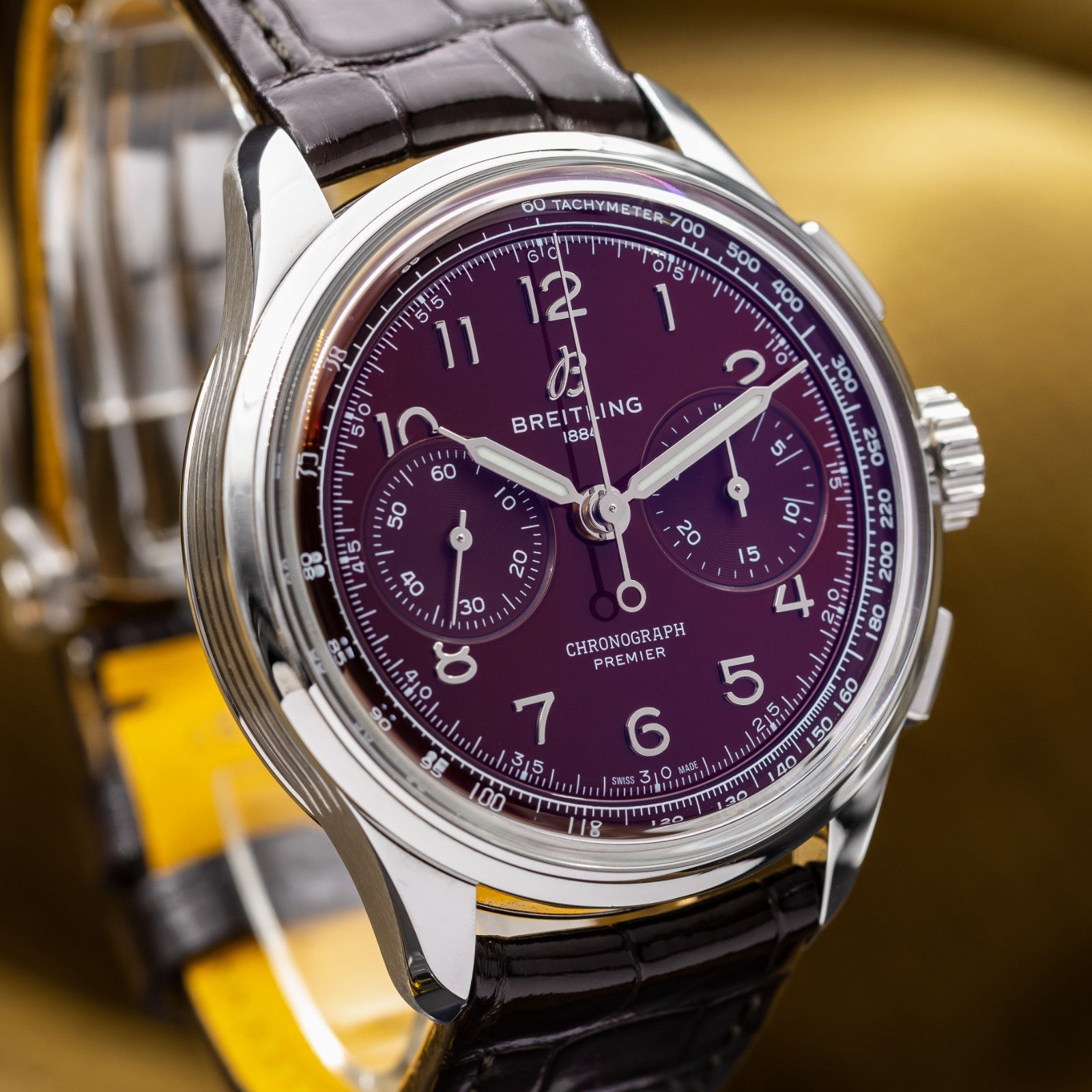 Ref No: AB0930D41K1P1 This rare burgundy dial Premier Chronograph only had 250 ever made! This latest generation, known for its vintage-inspired design and modern in-house movement, brings timeless elegance back to life. It also showcases Breitling’s highest level of watchmaking thanks to a range of iconic Premier complications: the Chronograph, the Duograph and the Datora. The stainless steel case paired with the eye-catching burgundy dial also adds a level of class and sophistication to this stunning piece. Come grab it while you can! Included are the watch travel case, Breitling retail tag and warranty card. This piece is from 2021. The case, crystal and buckle are in great condition. Watch is in complete working order and keeping great time. Don’t miss your chance to get this one before it’s gone! INCLUDED Watch Travel Case Breitling Warranty Card (2021) Breitling Retail Tag OFFERS Our pieces are always priced very competitively to the market. However, you are always welcome to make a reasonable offer. SHIPPING All watches are in stock and will usually be shipped to an eBay authenticator within 2 business days of payment verification. We offer free, fully insured FedEx shipping with tracking on all purchases with a US delivery destination. We also ship internationally via fully insured FedEx International Priority. However, buyers will be responsible for any potential import duties and customs fees applied by their country. All watches are carefully and professionally packaged to guarantee the safe arrival of your new timepiece. TAX eBay subjects all purchases made in America to its state’s applicable sales tax. That amount will be determined once you make your order. International customers are responsible for taxes applied by their country. AUTHENTICITY With over a decade of experience in the industry, we at Watches of Charlotte pride ourselves on being a trusted name in the industry. We work with watchmakers to authenticate our watches so we can guarantee that all of our pieces are 100% authentic and original. All photos used in our listings are taken in-house and are of the actual timepieces being purchased. We fully stand behind the authenticity of every product we sell. For extra peace of mind, eBay also offers an Authenticity Guarantee. This means that every detail of your watch is inspected by independent experts before you receive it, so you can have complete confidence. Our commitment to providing exceptional service has garnered us a loyal, worldwide clientele and a 5-star ranking on eBay, Facebook and elsewhere - check our reviews! ABOUT US We love everything about watches and thoroughly appreciate helping others discover the enjoyment of this pastime. Whether it’s helping you find your grail or the next watch to fill that empty slot in your watch box, we consider it a privilege to be part of your journey. Our aim is to be as fully transparent as possible in all our listings. Please let us know if you have questions about this watch or any of the others we have for sale. We’re always willing to entertain trade values up or down. We look forward to helping you secure your next timepiece!