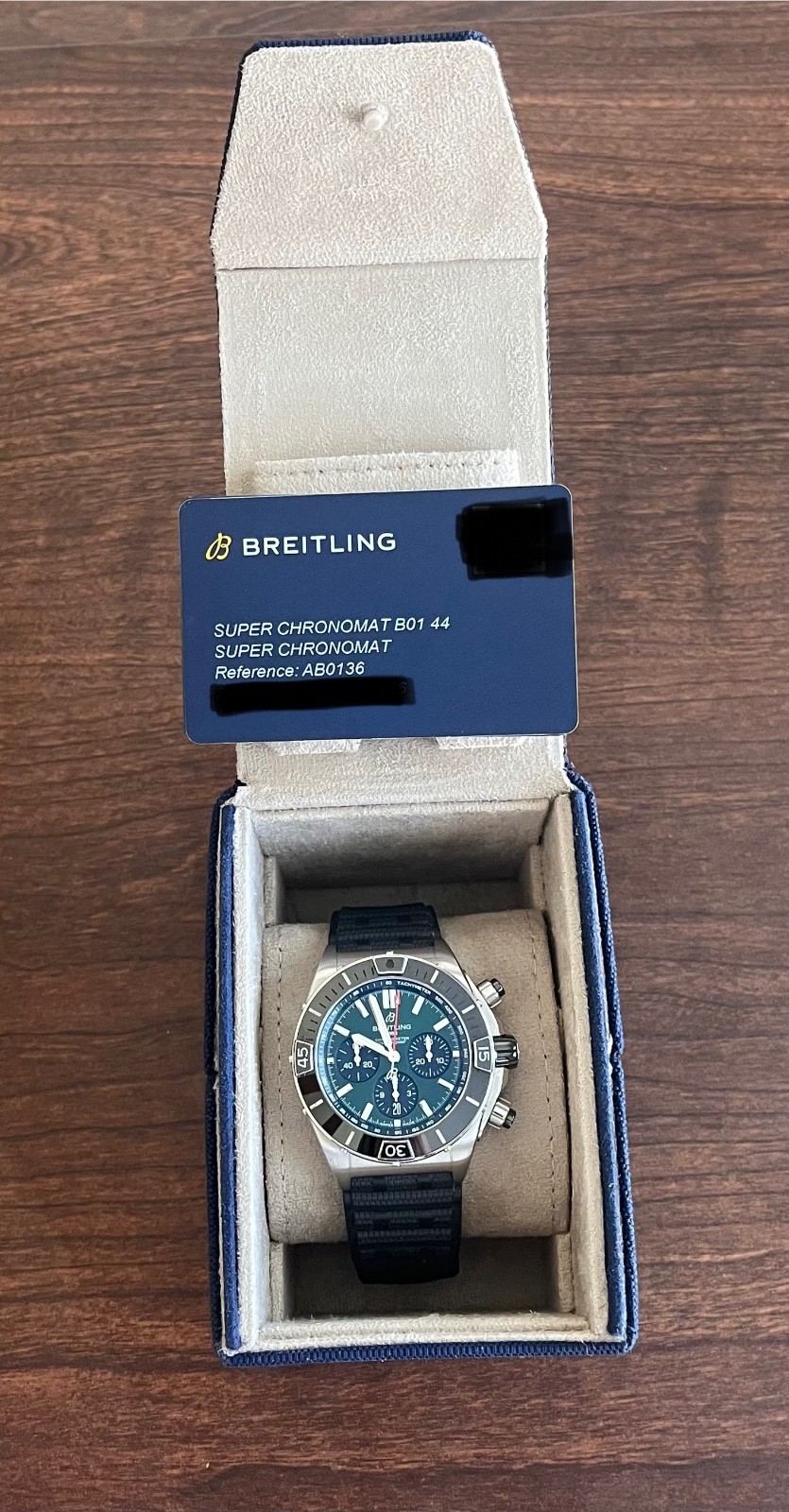 Model: Breitling Super Chronomat B01 Green AB0136 44mm The dial is just amazing😍😍😍 Factory warranty valid through SEP 2027. Excellent condition and full set.