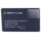 Breitling Superocean 46 Black Dial DLC Steel Mens Watch M17368 Box Card Breitling Superocean 46 Black Dial DLC Steel Mens Watch M17368 Box Card Click image to enlarge Description SwissWatchExpo 404-814-1814 Model number M17368 Stock number 57892 Year Serial number 728xxxx Gender Mens Movement Automatic self-winding movement. Case DLC coated stainless steel case 46.0 mm in diameter. Stainless steel screwed-down crown. Crystal Scratch resistant sapphire crystal. Dial Black dial with l uminescent stainless steel outlined hands and index hour markers. Arabic numerals at 6, 9, and 12. Date calendar window at 3. Minute markers around the outer rim. Bezel B lack stainless steel unidirectional revolving bezel. 0-60 elapsed-time. Bracelet Black rubber strap with stainless steel tang buckle Condition Excellent condition Engravings None Box & papers Breitling box and card Authenticity 100% authentic Working condition Timed to precision on Witschi watch expert timing machine. Running strong and keeping the accurate time. Warranty The watch is covered by Swiss Watch Expo one year warranty on anything but abuse Pictures All the photos are of the actual watch for sale Payment - We ONLY accept payments in United States Dollars (USD). - Payments must be made within 5 days of winning the auction. Shipping Shipping Methods All shipments are sent fully insured, using the following carrier methods: * Domestic - UPS. * International - No international shipping available Terms of Sale 18 month Limited Warranty Swiss Watch Expo is honored to have the opportunity to serve you. That's why we stand by all of our products with a full 18 month limited warranty. If an item we sell you should fail as a result of a manufacturer's defect at any time during the first year and a half , we will repair or replace the item at absolutely no cost to you. Not covered by warranty: - Regular wear-and-tear from normal use. - External damage to the product. Any damages resulting from wear to the watch case, crystal/glass, watch bracelet, watch bezel, straps, screws, crown/stem, finishes, clasps/buckles, or any other physical damage to the watch. - defects caused by outside force or improper use. Consequential and incidental damages. - the loss of precious, semi-precious stones from settings. - Outside modifications and third party repair attempts of any kind will void the warranty. - Any damage if used under conditions which exceed the watch manufacturer?s water resistance guidelines. - Watches that are labeled as water resistant feature a screw down crown. The crown must be screwed down properly at all times to keep the watch casing watertight. Water damage is not covered under the warranty unless it is proven defective by the SwissWatchExpo Repair and service Center. Our 100% Money-Back Guarantee At Swiss Watch Expo, we understand that your purchase is a significant investment - one that you will pass down to future generations. That's why we're happy to give you a no-questions-asked money-back guarantee with no restocking fees. If you're not satisfied with your purchase, just let us know within 7 days after the purchase and we'll honor your return and issue a full refund, no questions asked. *Deductible amount for domestic shipping costs: $50 About Us This fine piece is a part of collection offered by Swiss Watch Expo , members of the National Association of Watch and Clock Collectors (NAWCC) and the International Watch and Jewelry Guild (IWJG). We are third generation jewelers who have been selling fine Swiss timepieces and elegant jewelry since 1982. We've built our reputation on quality, service and integrity, and we treat each customer with the utmost respect. We stand by all of our products with a generous warranty and guarantee, so you always know that when you bid with Swiss Watch Expo , you can can bid with confidence! About Swiss Watch Expo Thank you for the opportunity to serve you and welcome the Swiss Watch Expo ebay auction, where we proudly offer our collection of top quality Swiss timepieces and fine jewelry. We are third generation European trained master watchmakers and jewelry makers dealing in Fine Swiss watches, elegant gemstones and precious jewelry for nearly 30 years. Why You Should Choose Swiss Watch Expo Unlike many online resellers, at Swiss Watch Expo , we have built our business the old fashioned way - through our brick and mortar store in Atlanta, Georgia, providing our customers the very best products at an incredible value, while giving them the exemplary service they deserve. Now, as we serve the Ebay community, our commitment to the same philosophies holds true. We invite you to browse through our customer feedback to read about the experience others have had with us through Ebay. What Makes Swiss Watch Expo Products Better Than The Competition Every watch we sell has been completely inspected to ensure years of optimal functionality. What's more, there are never any middlemen involved in the process. From the time we purchase a watch, our experianced master watchmakers handle all repairs and restoration, making the watch as good as new. We've invested thousands into our state-of-the-art repair facility in order to carry out our commitment to quality. As for jewelry, every item is of the highest quality, using only the finest precious metals and gemstones available. When You Choose Swiss Watch Expo , You Have Nothing To Lose When you purchase an item from Swiss Watch Expo on Ebay, you have complete peace of mind. That's because we offer you a generous money-back guarantee without any restocking fee, no questions asked. Our philosophy is simple: By being committed to quality, service and value, we have satisfied customers who come back to us time and time again. Our entire staff is committed to providing you unparalleled quality and incomparable service. We hope that we have the opportunity to provide you with the same experience our loyal customers have come to expect from Swiss Watch Expo. Get i