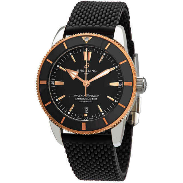 UB2030121B1S1 MEN'S BREITLING SUPEROCEAN HERITAGE II B20 AUTOMATIC 44 DIVING WATCH - With Manufacturer Serial Numbers - Save Off The Manufacturer Retail Price of $6,850 - Swiss Made - Black Dial with Rose Gold Accents - Index Hour Markers - Solid 18k Rose Gold Bezel with Black Ceramic Bezel Insert - Date Feature - 70 Hour Power Reserve - Self-winding Automatic Movement COSC Chronometer Certified - Breitling Caliber B20 - Vibrations Per Hour: 28,800 - Jewels: 28 - 6 Year Warranty - Guaranteed Authentic - Certificate of Authenticity - Manufacturer Box & Manual - Polished Stainless Steel Case - Black Aero Classic Rubber Strap - Cambered Scratch Resistant Sapphire Crystal Glareproofed on Both Sides - 200 Meters / 660 Feet Water-Resistant - 44mm = 1 3/4" Case, 7" Adjustable Strap - Case Thickness: 14.55mm - Inlet Size: 22mm - Unidirectional Rotating Bezel - Luminescent Hands & Hour Markers - Screw Down Crown & Case Back - Stainless Steel Push-Button Deployment Buckle ;;