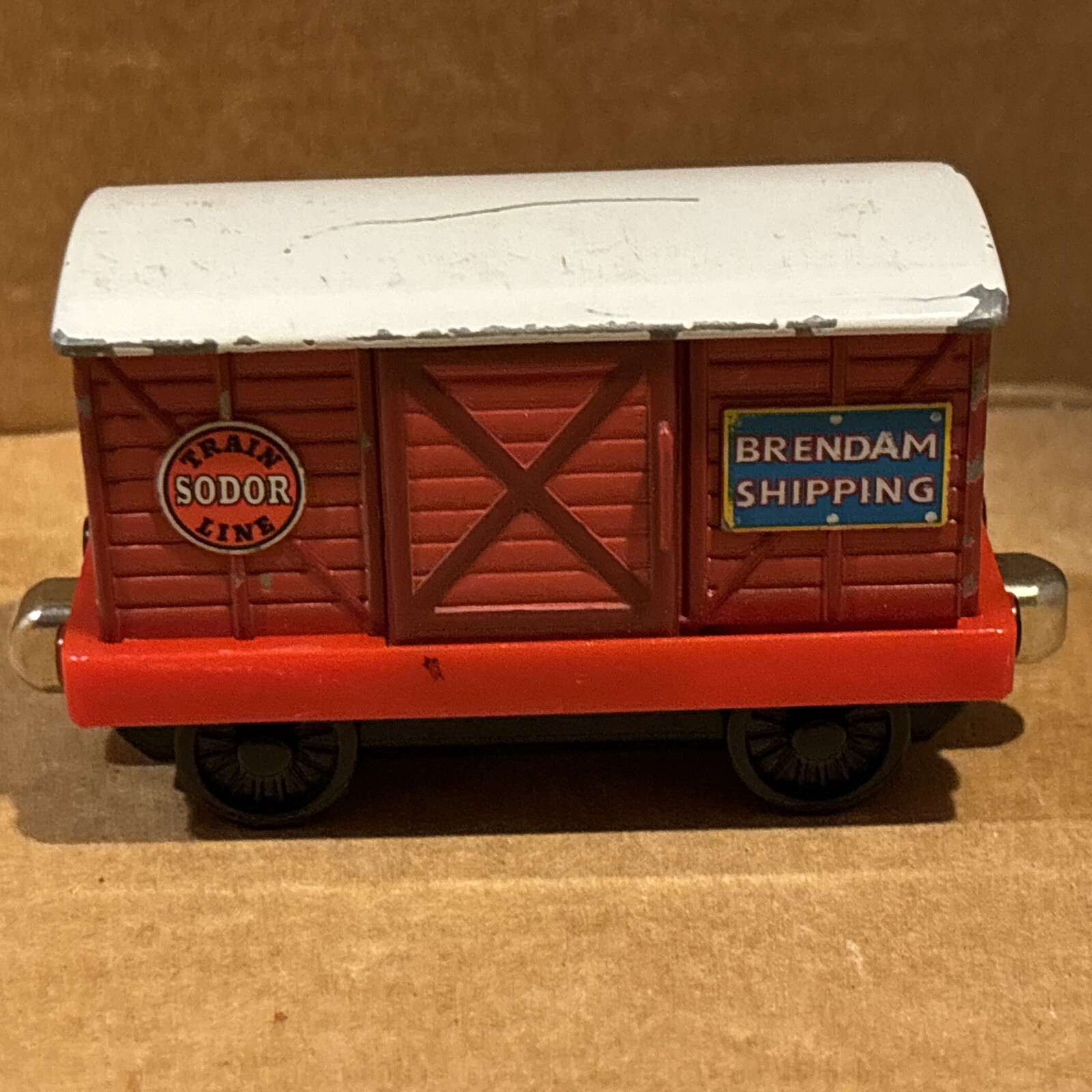 Sodor Train Line Brendam Shipping Cargo Carg with door that open and closes, and each time rotates a different of three cargos looks - Sodor works, sodor frozen fish, & Mr Jolly’s chocolate. Diecast Thomas & Friends Train Tank Engine Metal see photos. One big paint scratch on top. Ships usps ground advantage.