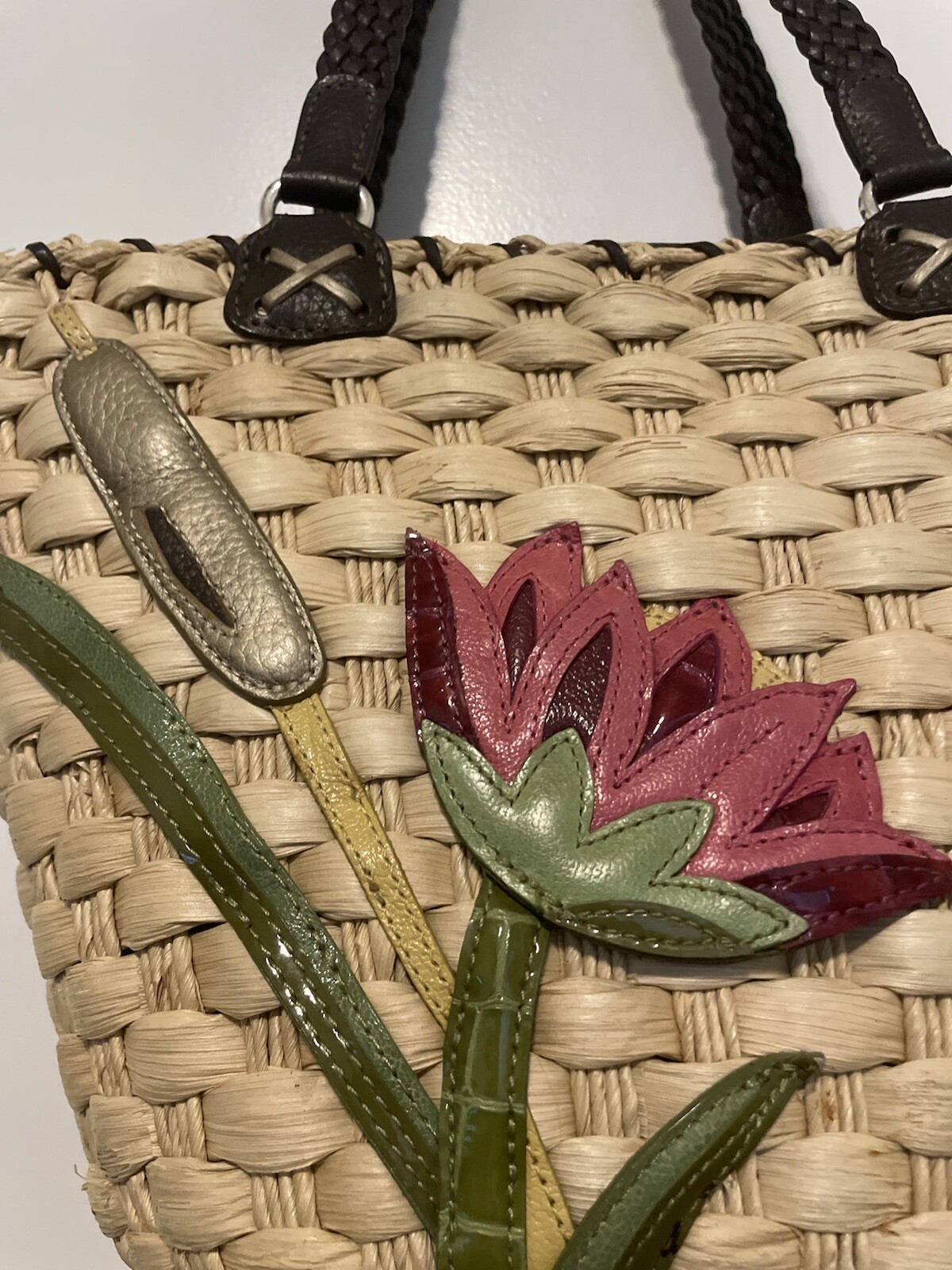 Brighton Women's Beach Tote Bag is a medium-sized tote made of raffia and leather, with a floral pattern and a silver hardware accent. It has a magnetic closure and double leather handles in brown. The lining is made of green raffia and the bag has a width of 13 inches, a height of 9 inches, and a depth of 5 inches. The bag is suitable for travel, party/cocktail, and casual occasions, and it is designed with a beach and classic theme.
