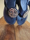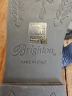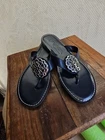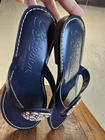 The Brighton Alice Classic Navy Blue Leather Thong Sandals in size 8M are versatile for casual or dressy occasions, with a slip-on style and flat heel for all-day comfort. These stylish sandals feature medallion and logo accents, a slip-resistant rubber outsole, and breathable leather upper material. The elegant navy blue color and silver accents make them suitable for both dressy and casual outfits, embodying a bohemian and floral theme perfect for the summer, fall, and spring seasons. Made in Italy, these sandals offer a chic and practical addition to any woman's wardrobe....B2478