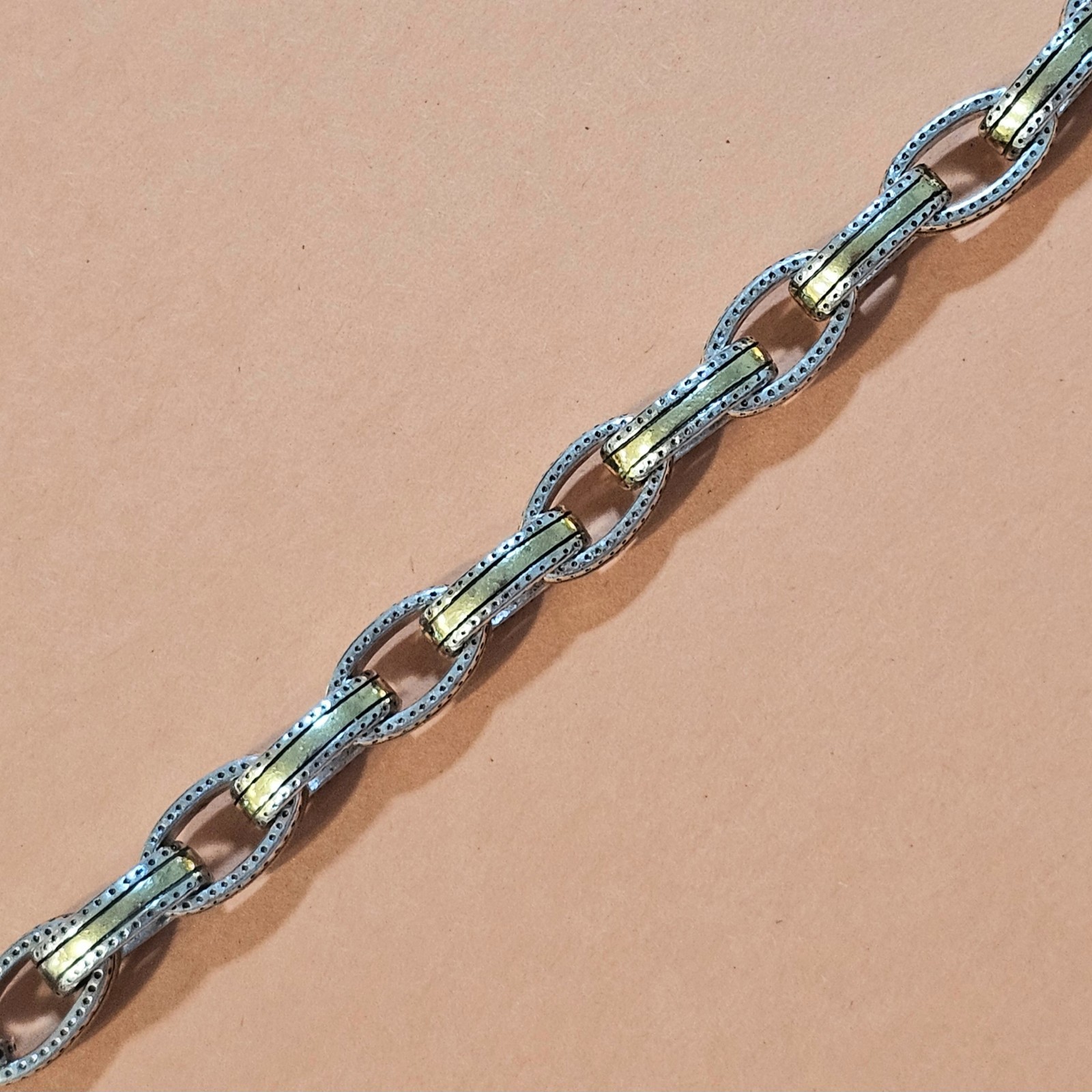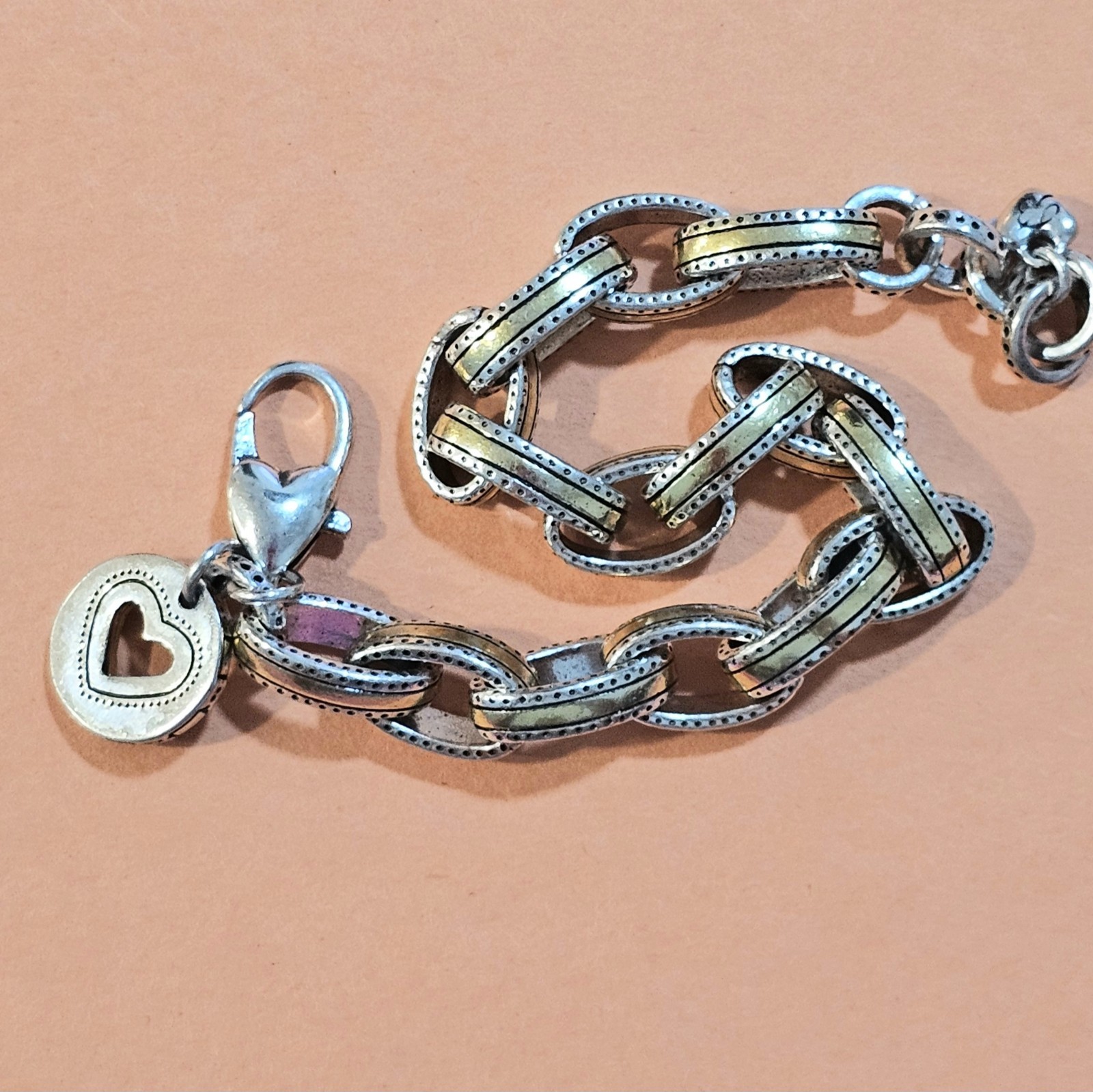 Condition & Extras This gently used bracelet is ready to wear or gift. It is not just any run-of-the-mill bracelet, but a polished, collectible piece. Description This is a two-tone silver-and-gold link bracelet by Brighton, featuring substantial oval links accented with a dotted edge detail for a refined, classic look. A heart-shaped charm pendant and lobster-claw clasp add subtle yet distinctive Brighton charm. The design sets it apart from basic bracelets... it feels substantial, elegant, and versatile enough for both day wear and dressed-up occasions. Dimensions The bracelet measures approximately 8 inches long making it perfect for most wrists. Why It’s Special This is more than a bracelet... it’s a statement. The mixed-metal look offers the flexibility to pair with silver or gold accessories. The heart charm gives it timeless appeal. And because it comes with the original Brighton dust bag, it’s ideal for gifting or gifting-to-self. About the Brand Brighton jewelry is known for thoughtful details and quality finishes that give each piece a signature style and longevity. Ready for a New Home If you’re looking for a bracelet that blends timeless style with everyday versatility and stands out as a top-tier Brighton piece, this is it. Grab it now before someone else does.